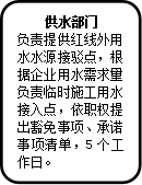 10、供水部門(mén):負(fù)責(zé)提供紅線外用水水源接駁點(diǎn),根據(jù)企業(yè)用水需求量負(fù)責(zé)臨時(shí)施工用水接入點(diǎn),依職權(quán)提出豁免事項(xiàng)、承諾事項(xiàng)清單,5個(gè)工作日。