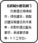 4、住房城鄉(xiāng)建設(shè)部門(mén):負(fù)責(zé)提出海綿城市、綠色建筑、裝配式建筑等建設(shè)條件清單、依職權(quán)提出豁免事項(xiàng)、承諾事項(xiàng)清單,5個(gè)工作日。