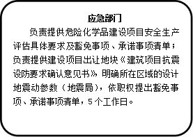 6、應(yīng)急部門(mén):負(fù)責(zé)提供危險(xiǎn)化學(xué)品建設(shè)項(xiàng)目安全生產(chǎn)評(píng)估具體要求及豁免事項(xiàng)、承諾事項(xiàng)清單;負(fù)責(zé)提供建設(shè)項(xiàng)目出讓地塊《建筑項(xiàng)目抗震設(shè)防要求確認(rèn)意見(jiàn)書(shū)》,明確所在區(qū)域的設(shè)計(jì)地震動(dòng)參數(shù)(地震局),依職權(quán)提出豁免事項(xiàng)、承諾事項(xiàng)清單,5個(gè)工作日。