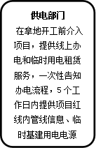 9、供電部門(mén):在拿地開(kāi)工前介入項(xiàng)目,提供線上辦電和臨時(shí)用電租賃服務(wù),一次性告知辦電流程,5個(gè)工作日內(nèi)提供項(xiàng)目紅線內(nèi)管線信息、臨時(shí)基建用電電源點(diǎn)。