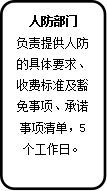 14、人防部門(mén):配合園區(qū)完成人防區(qū)域評(píng)估、實(shí)施。負(fù)責(zé)提供人防建設(shè)、人防質(zhì)量監(jiān)督備案受理的具體要求、收費(fèi)標(biāo)準(zhǔn),依職權(quán)提出豁免事項(xiàng)、承諾事項(xiàng)清單,5個(gè)工作日。