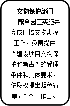 16、文物保護(hù)部門(mén):配合園區(qū)實(shí)施并完成園區(qū)區(qū)域內(nèi)文物調(diào)查勘探工作。負(fù)責(zé)提供“建設(shè)項(xiàng)目文物保護(hù)和考古許可”的受理?xiàng)l件和具體要求,明確收費(fèi)標(biāo)準(zhǔn)、繳費(fèi)方式,依職權(quán)提出