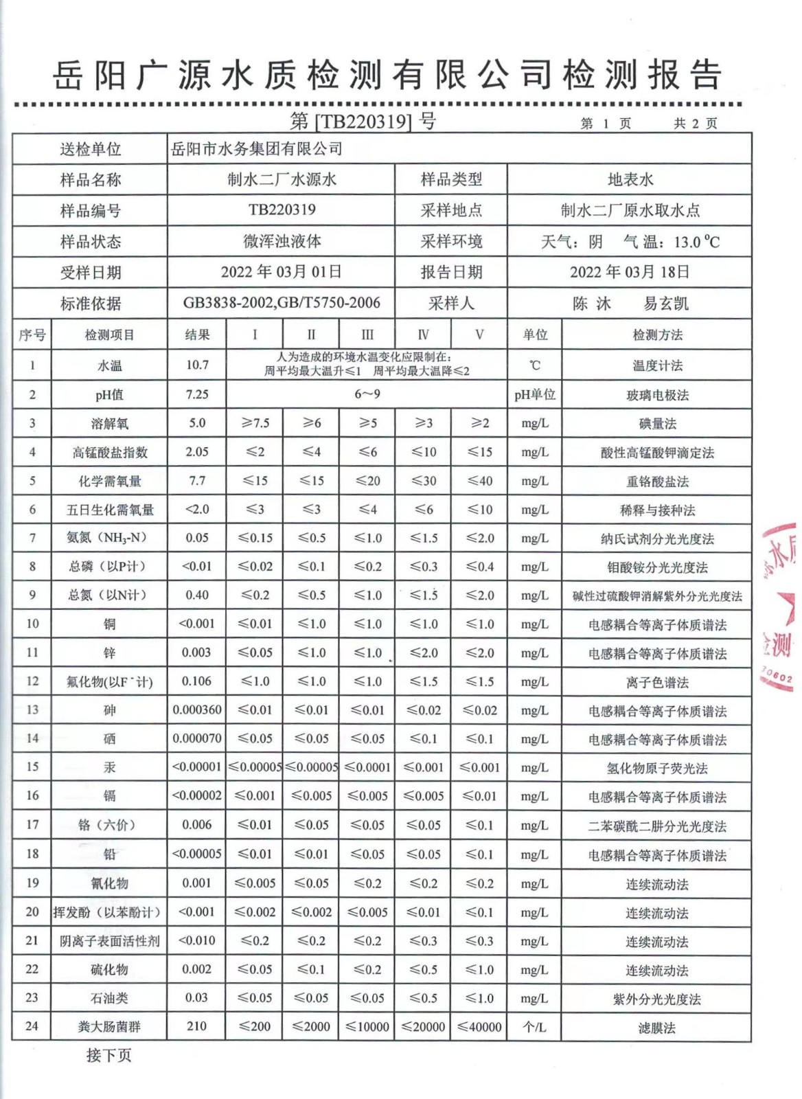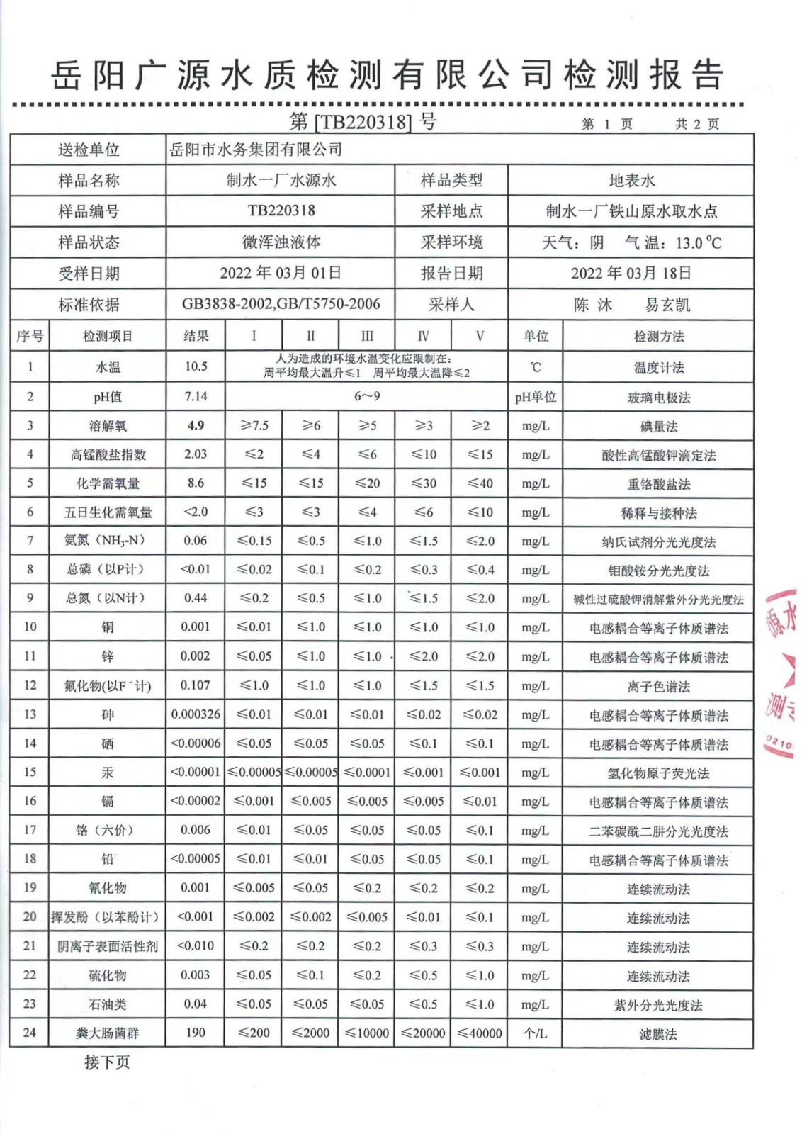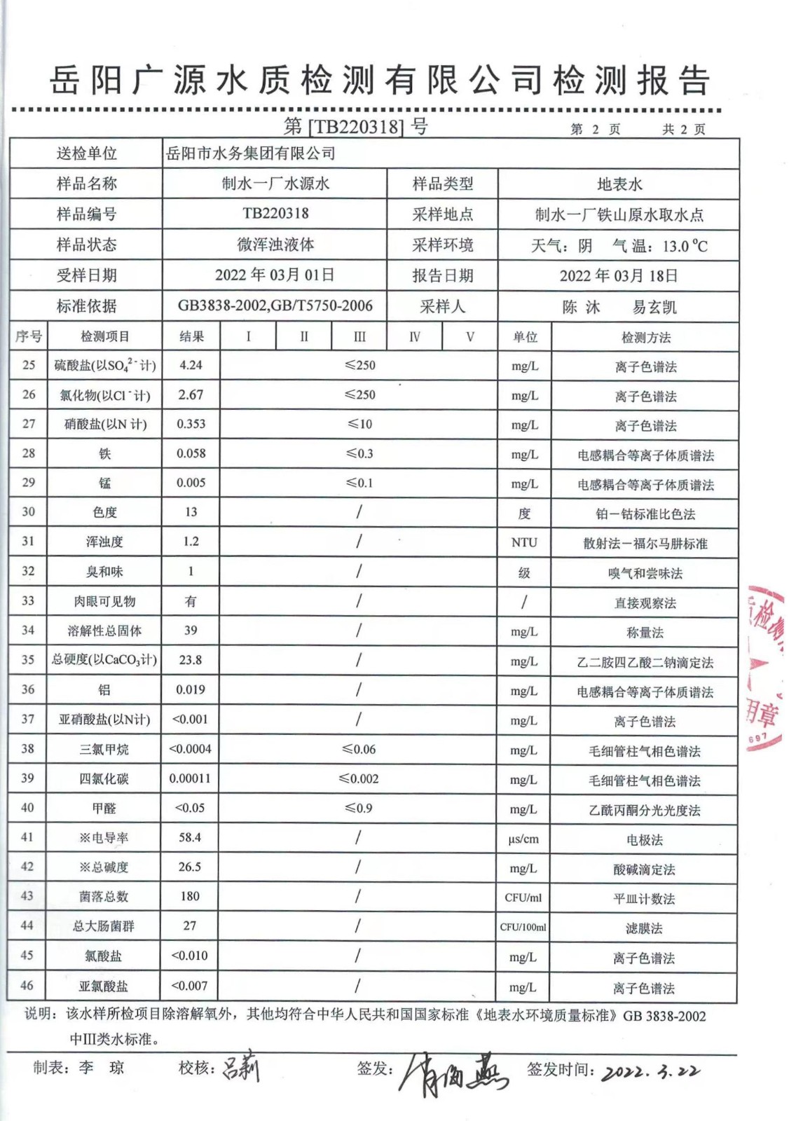 上一篇:2022年03月岳陽市水務(wù)集團出廠水水質(zhì)檢測月報表
