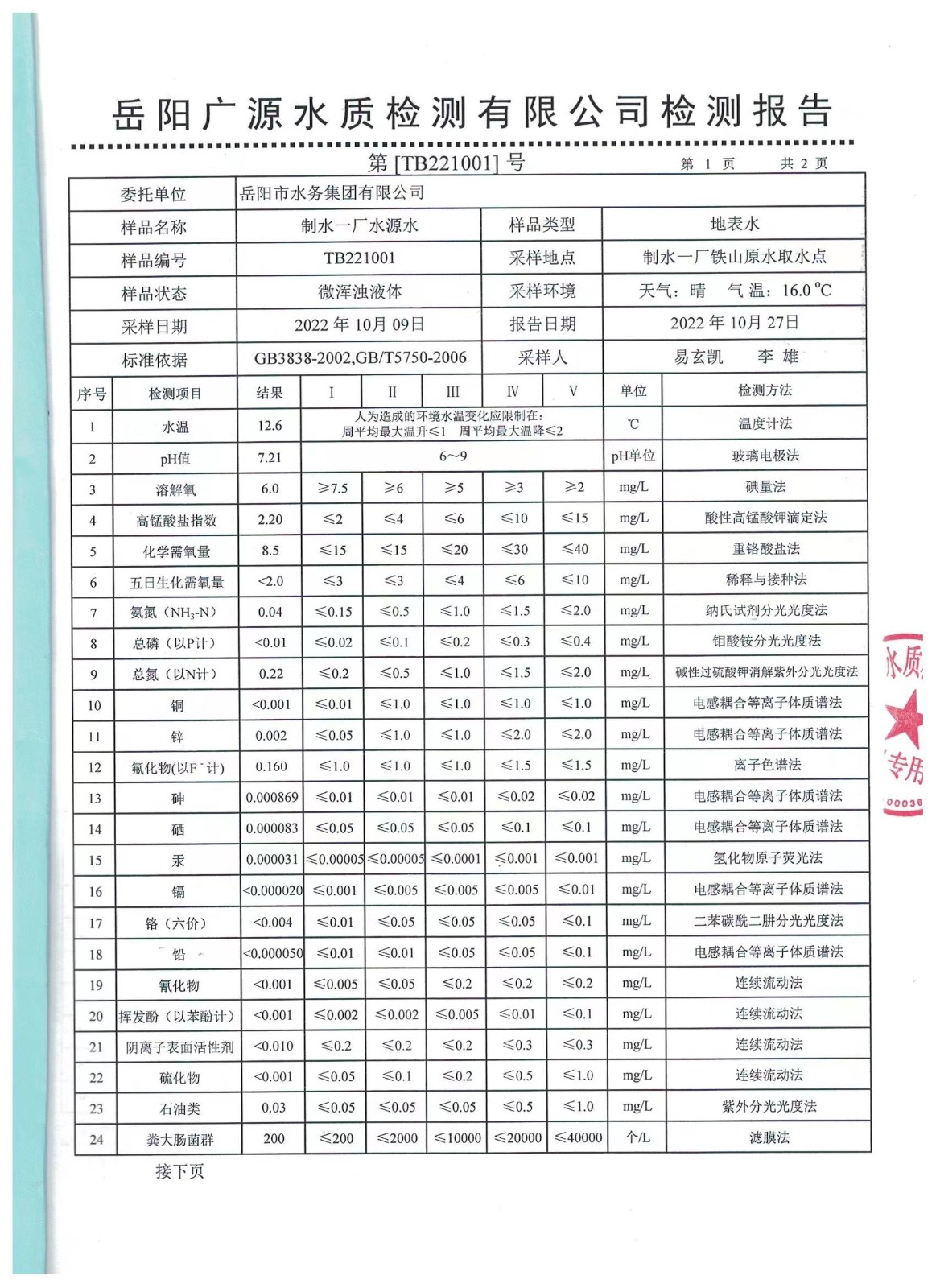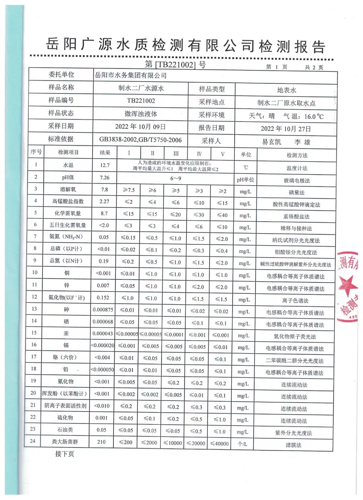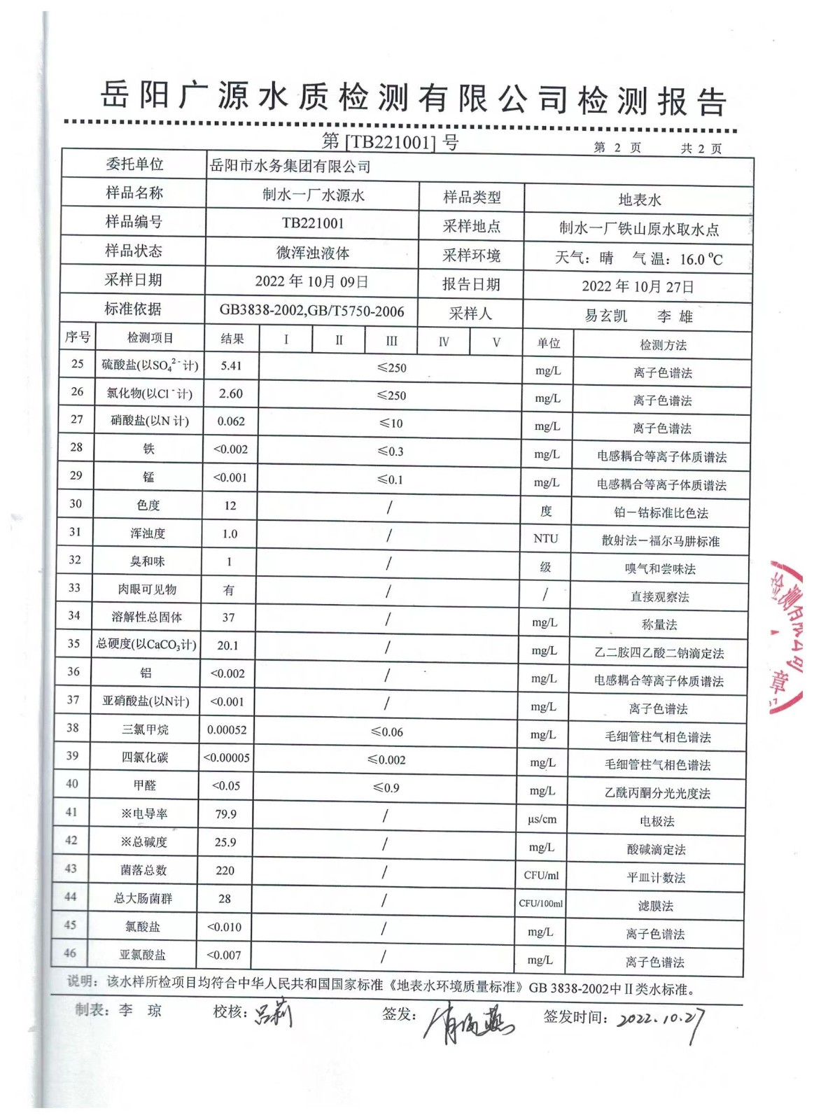 上一篇:2022年10月岳陽(yáng)市水務(wù)集團(tuán)出廠水水質(zhì)檢測(cè)月報(bào)表