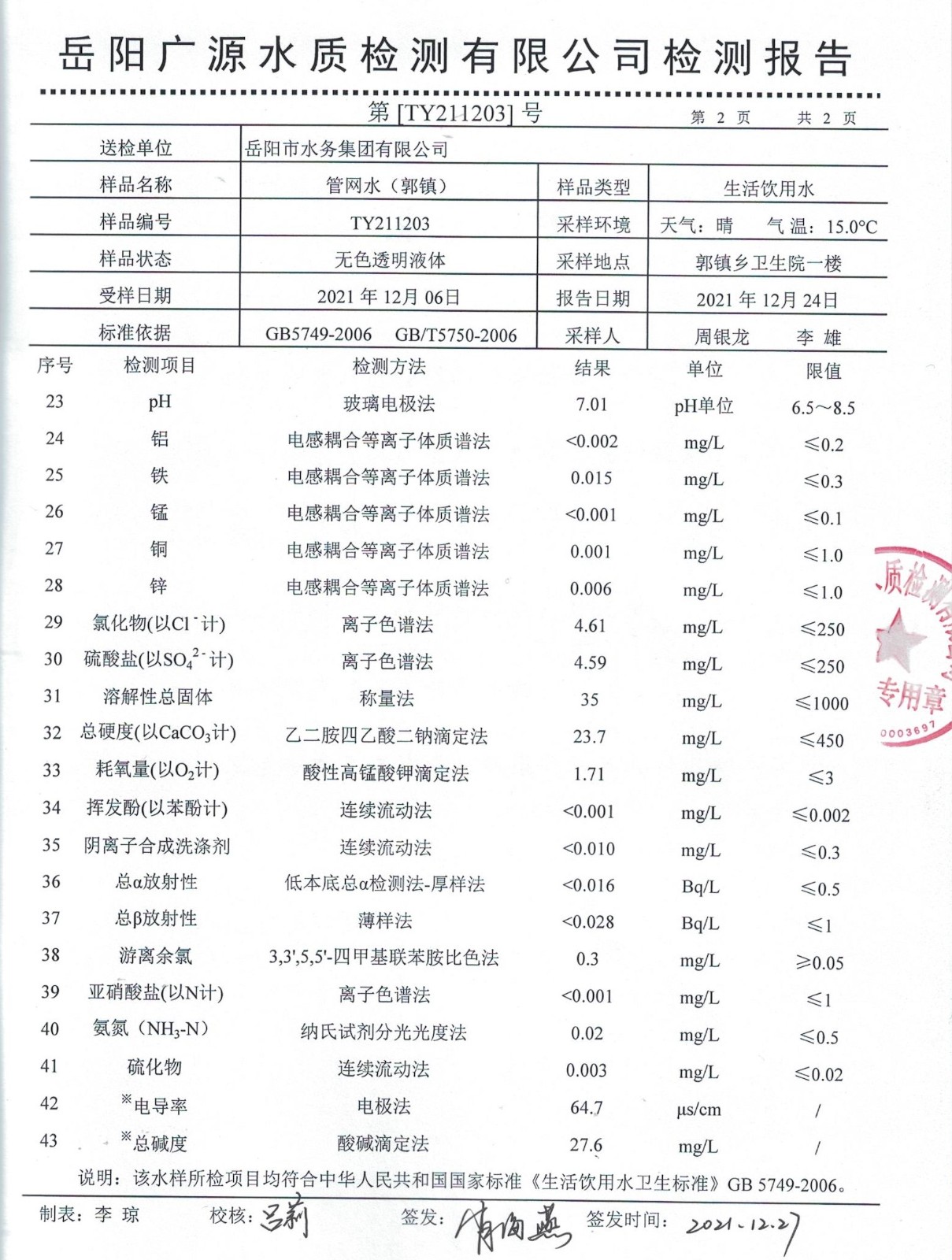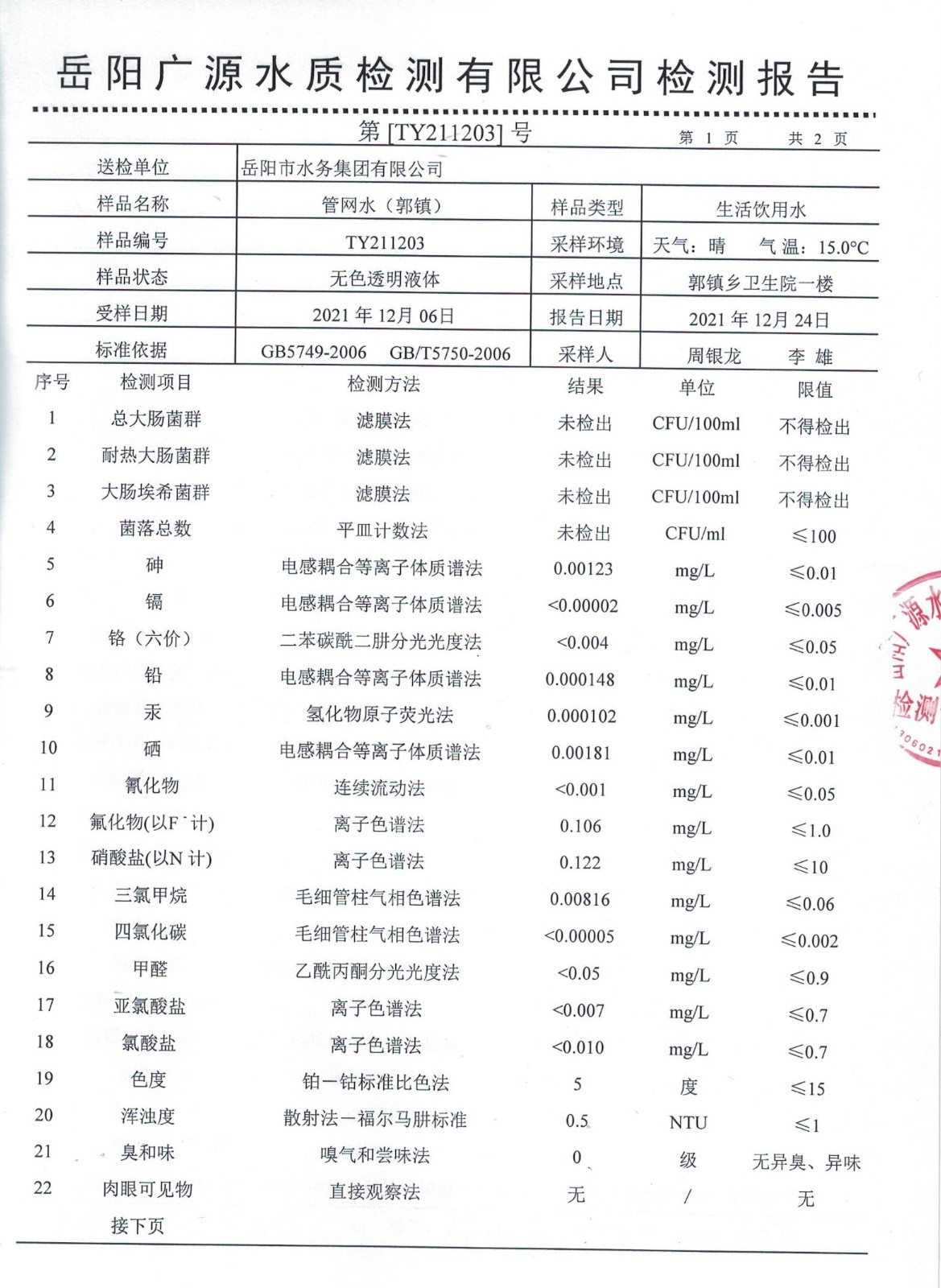 下一篇:2021年12月岳陽市水務(wù)集團(tuán)出廠水水質(zhì)檢測月報(bào)表