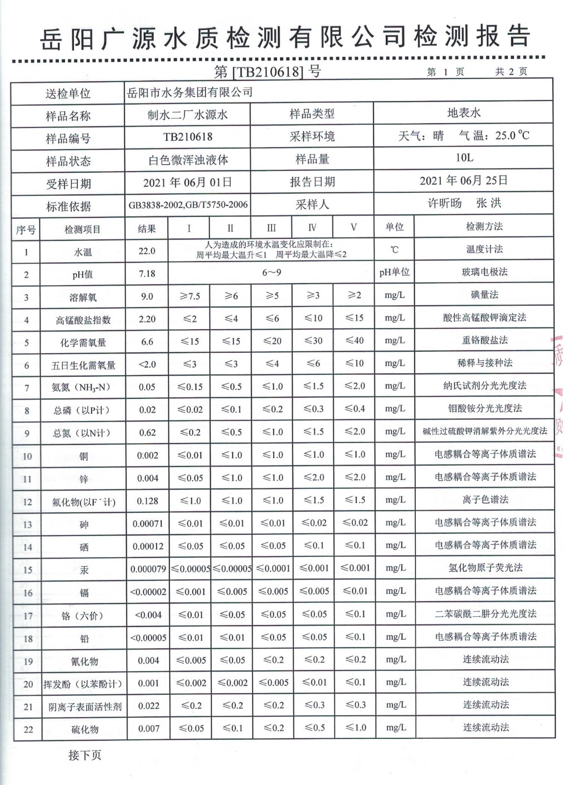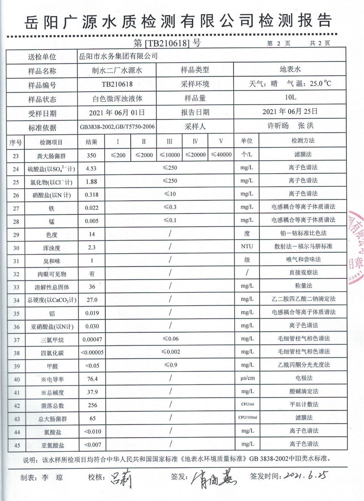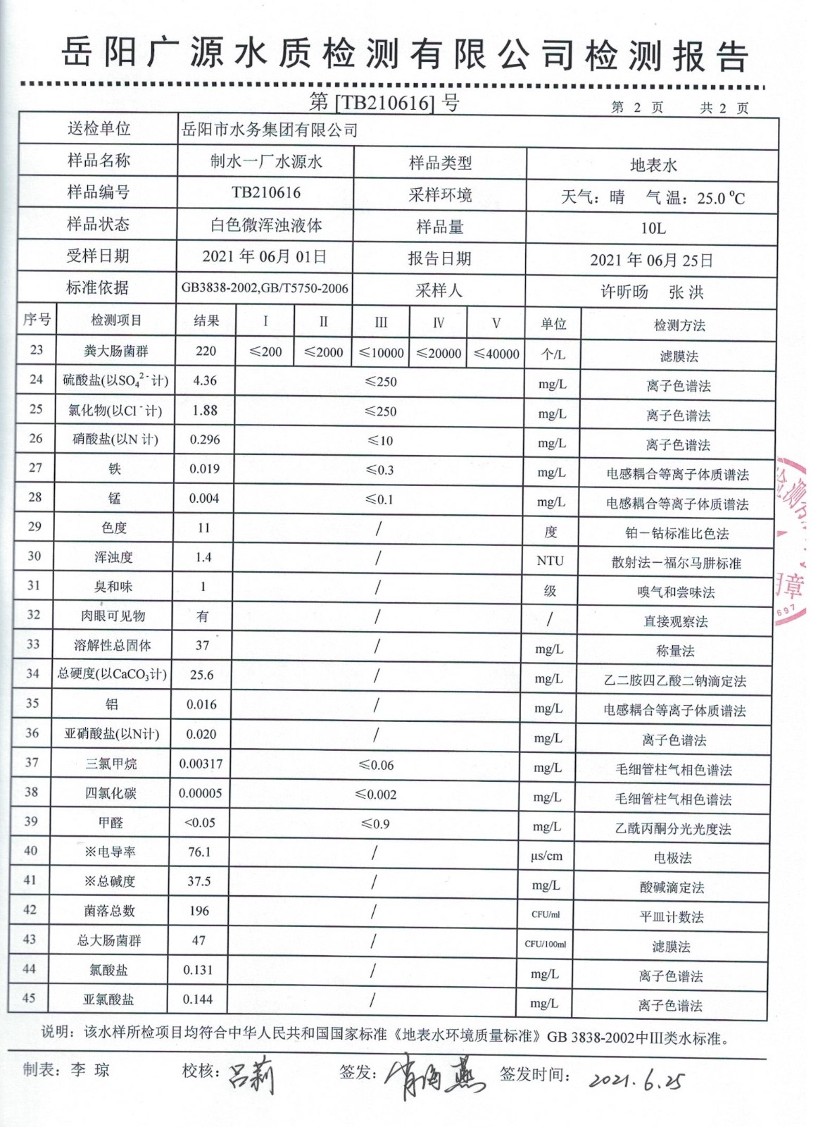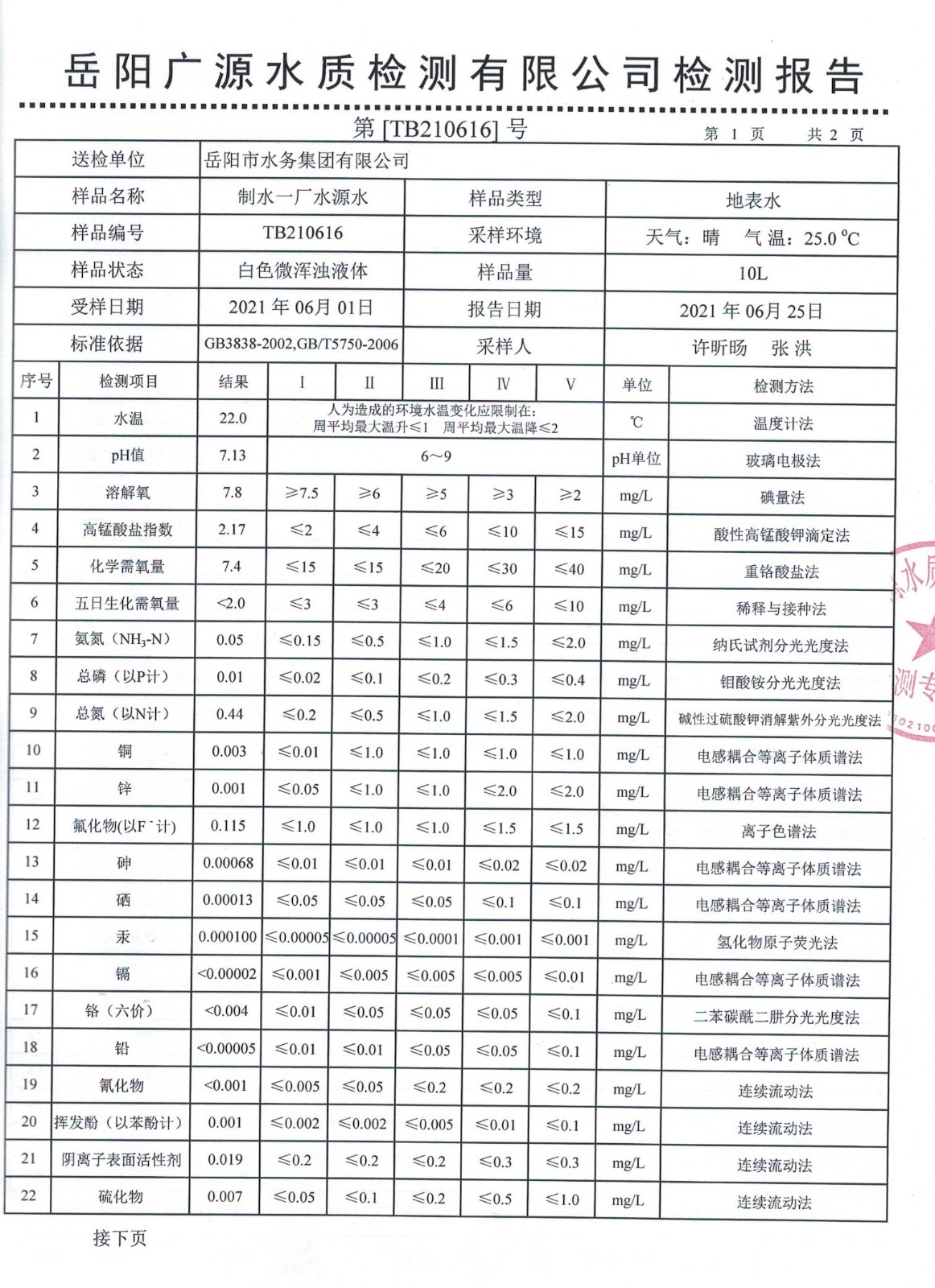 上一篇:2021年06月岳陽市水務(wù)集團出廠水水質(zhì)檢測月報表