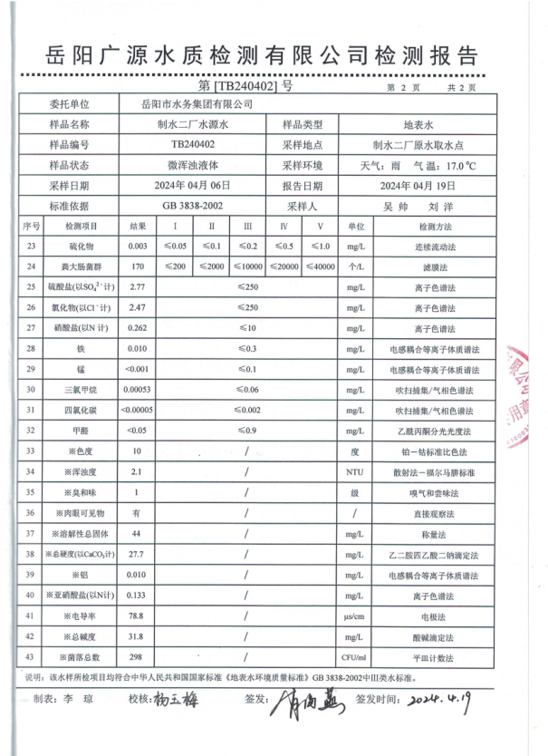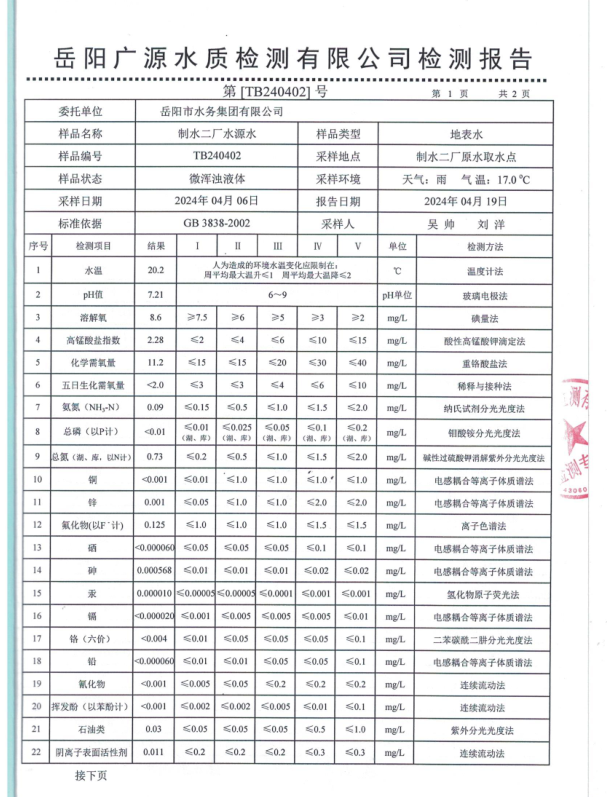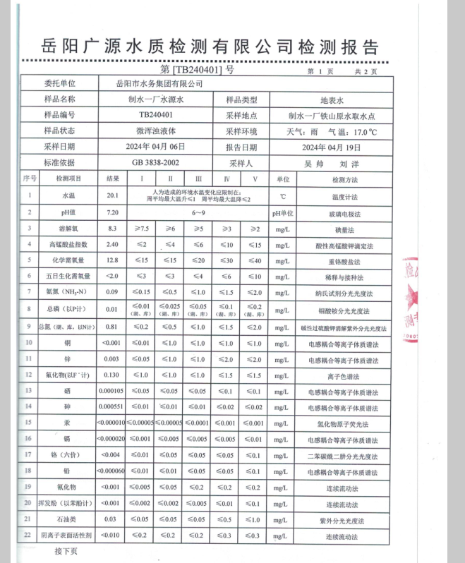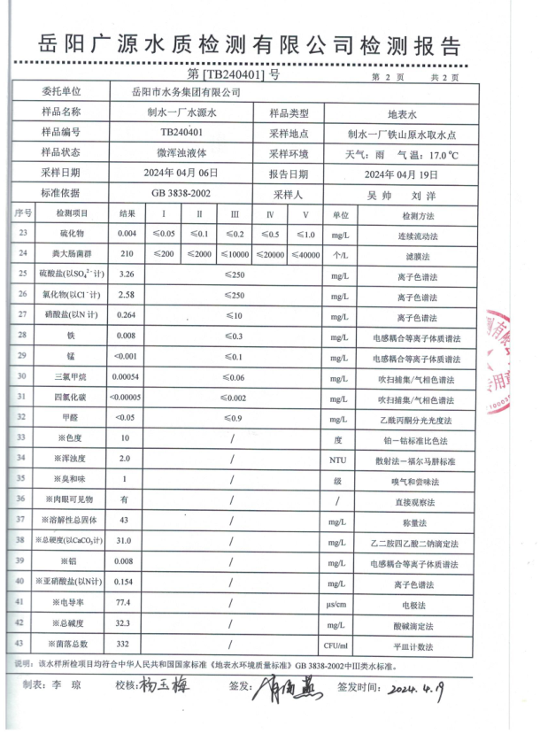 下一篇:2024年4月岳陽市水務(wù)集團出廠水水質(zhì)檢測月報表
