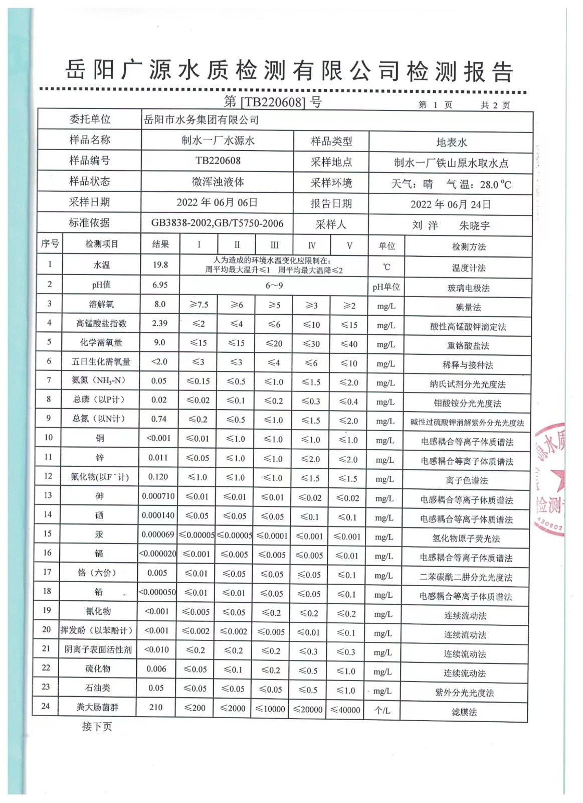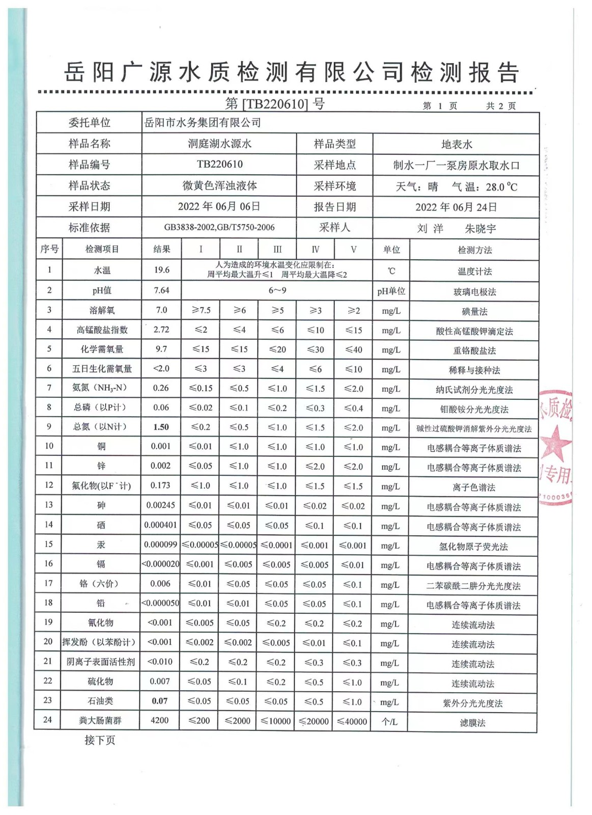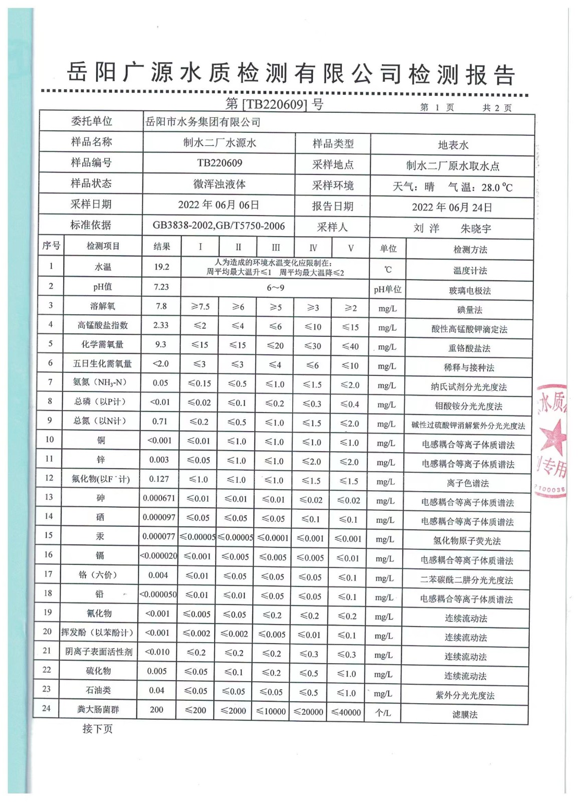 上一篇:2022年06月岳陽市水務集團出廠水水質(zhì)檢測月報表