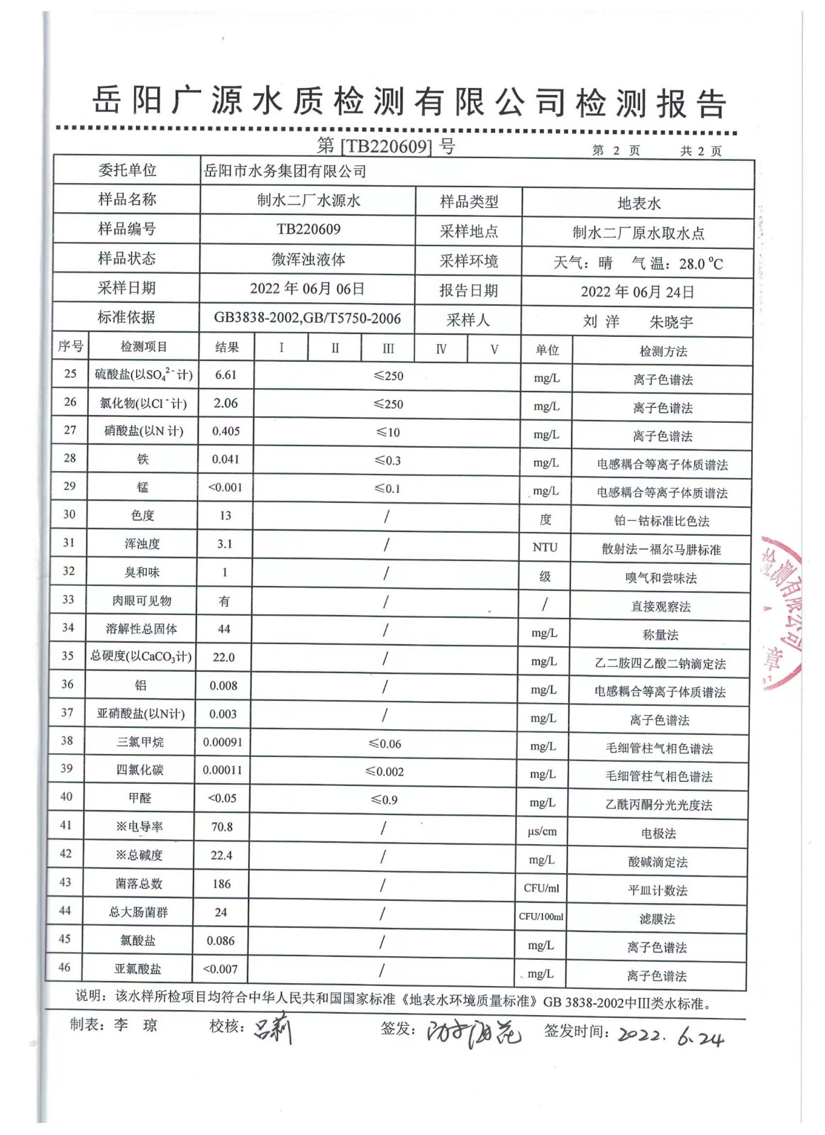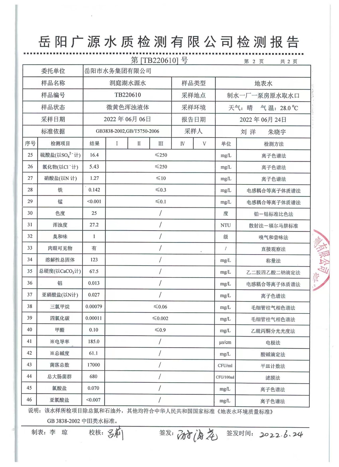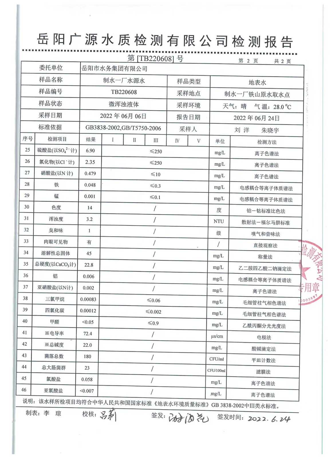 上一篇:2022年06月岳陽市水務集團出廠水水質(zhì)檢測月報表