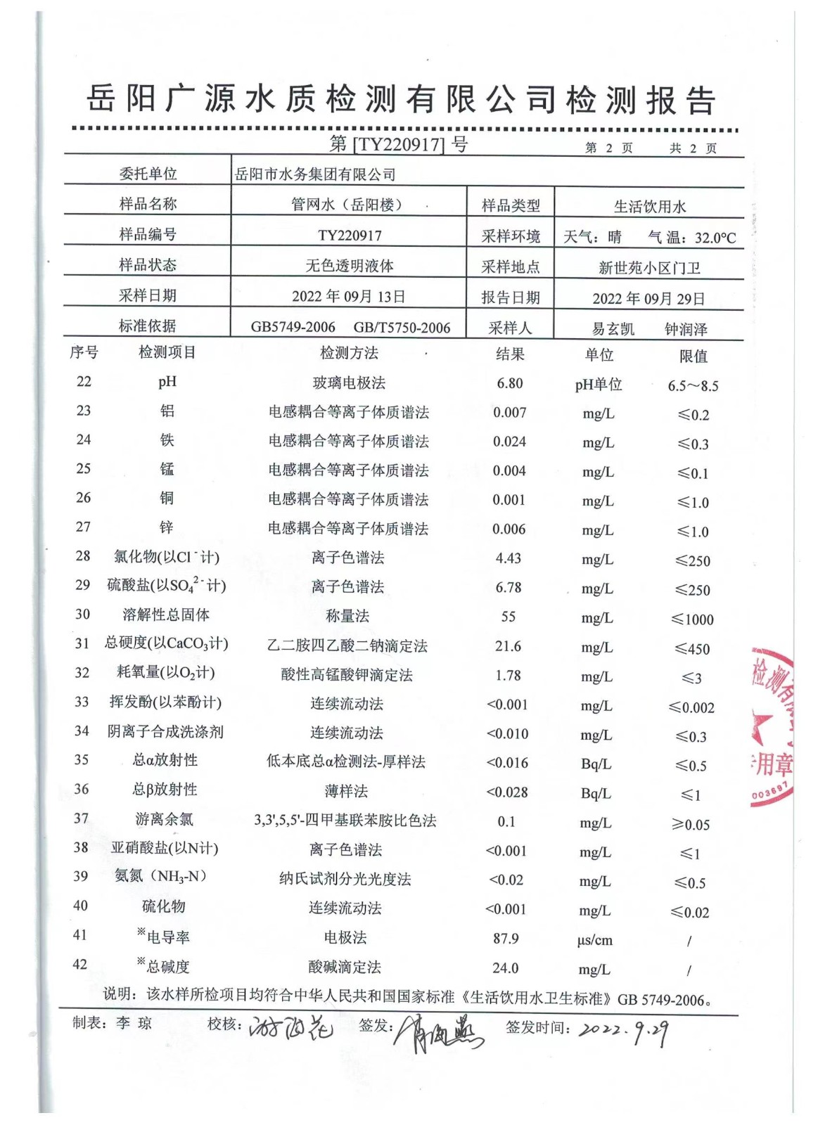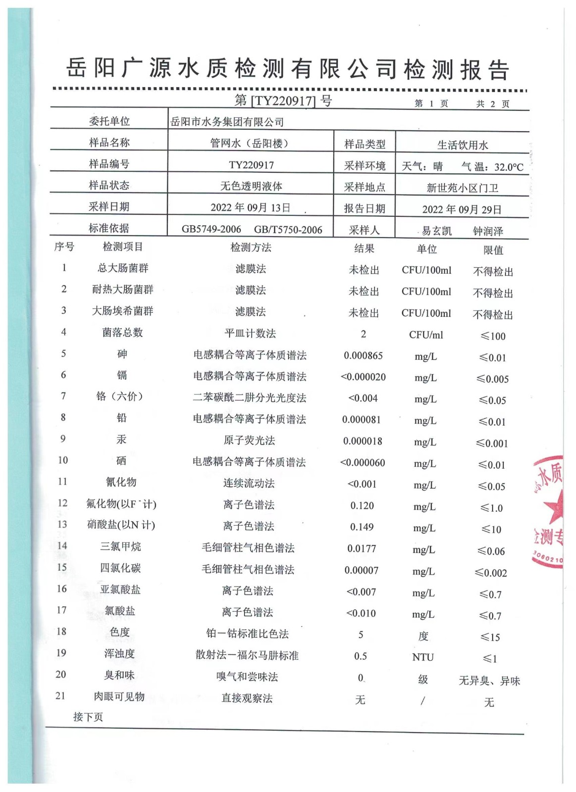 下一篇:2022年09月岳陽市水務(wù)集團(tuán)出廠水水質(zhì)檢測月報表