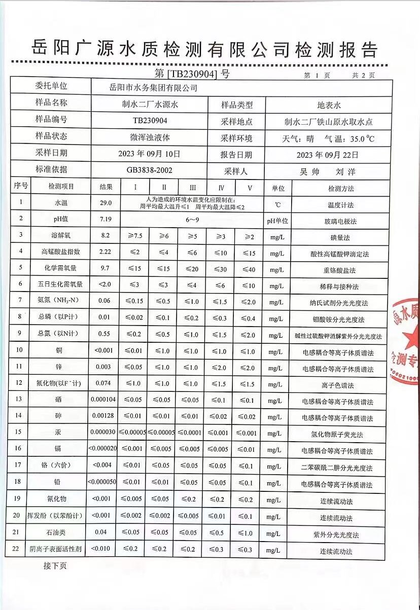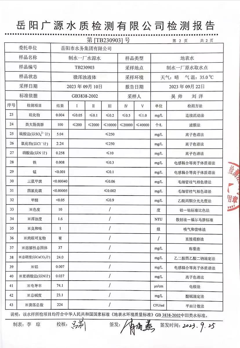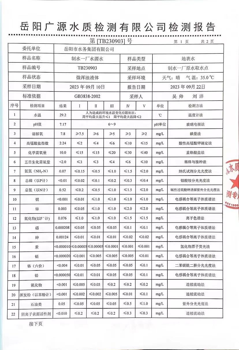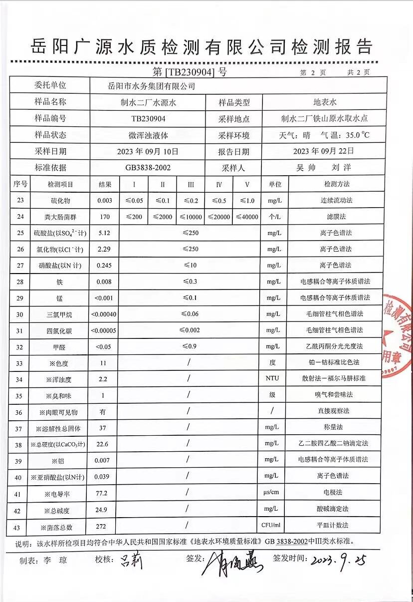 下一篇:2023年9月岳陽市水務(wù)集團出廠水水質(zhì)檢測月報表