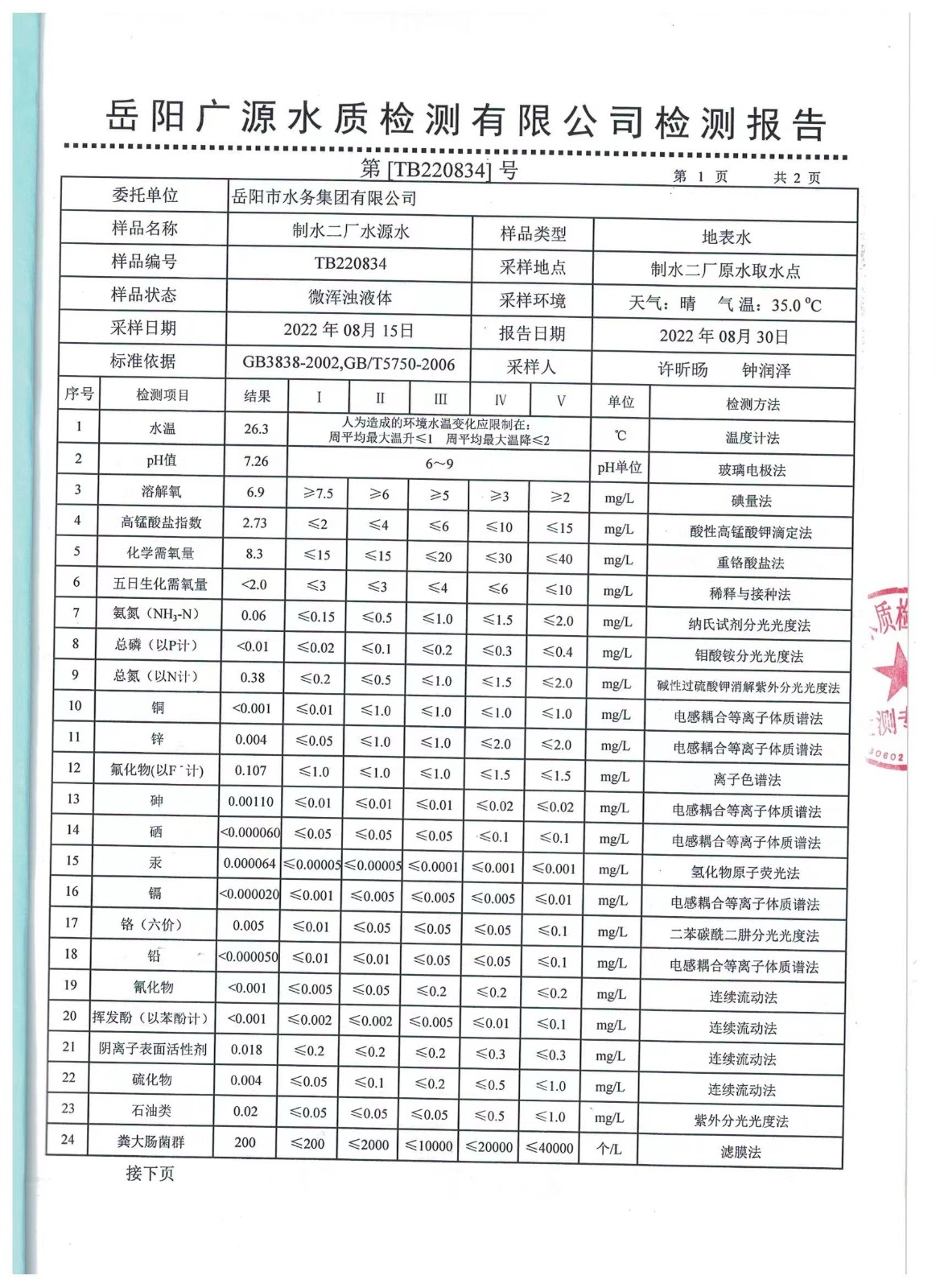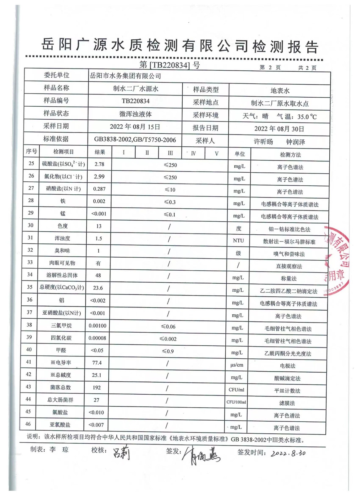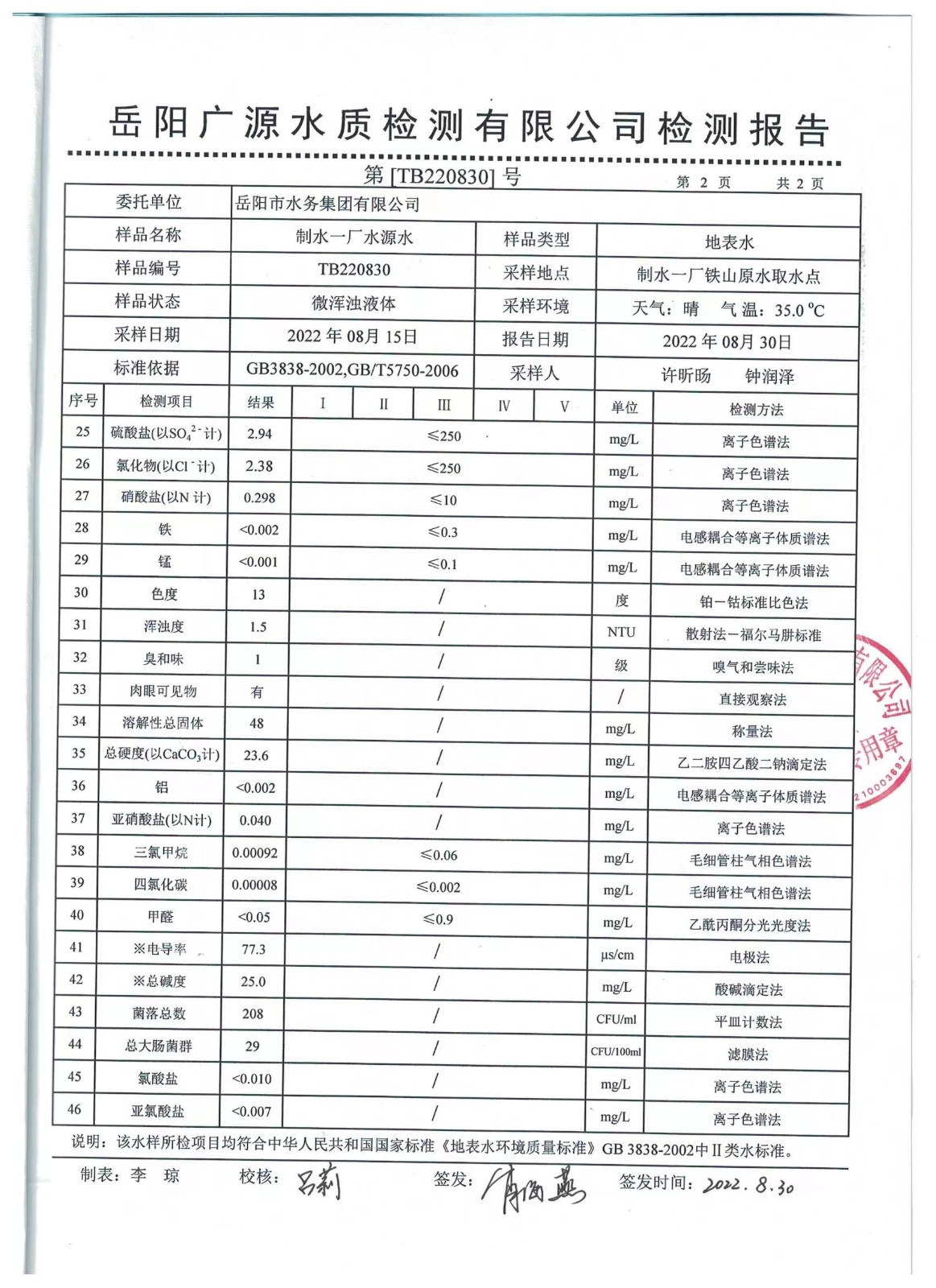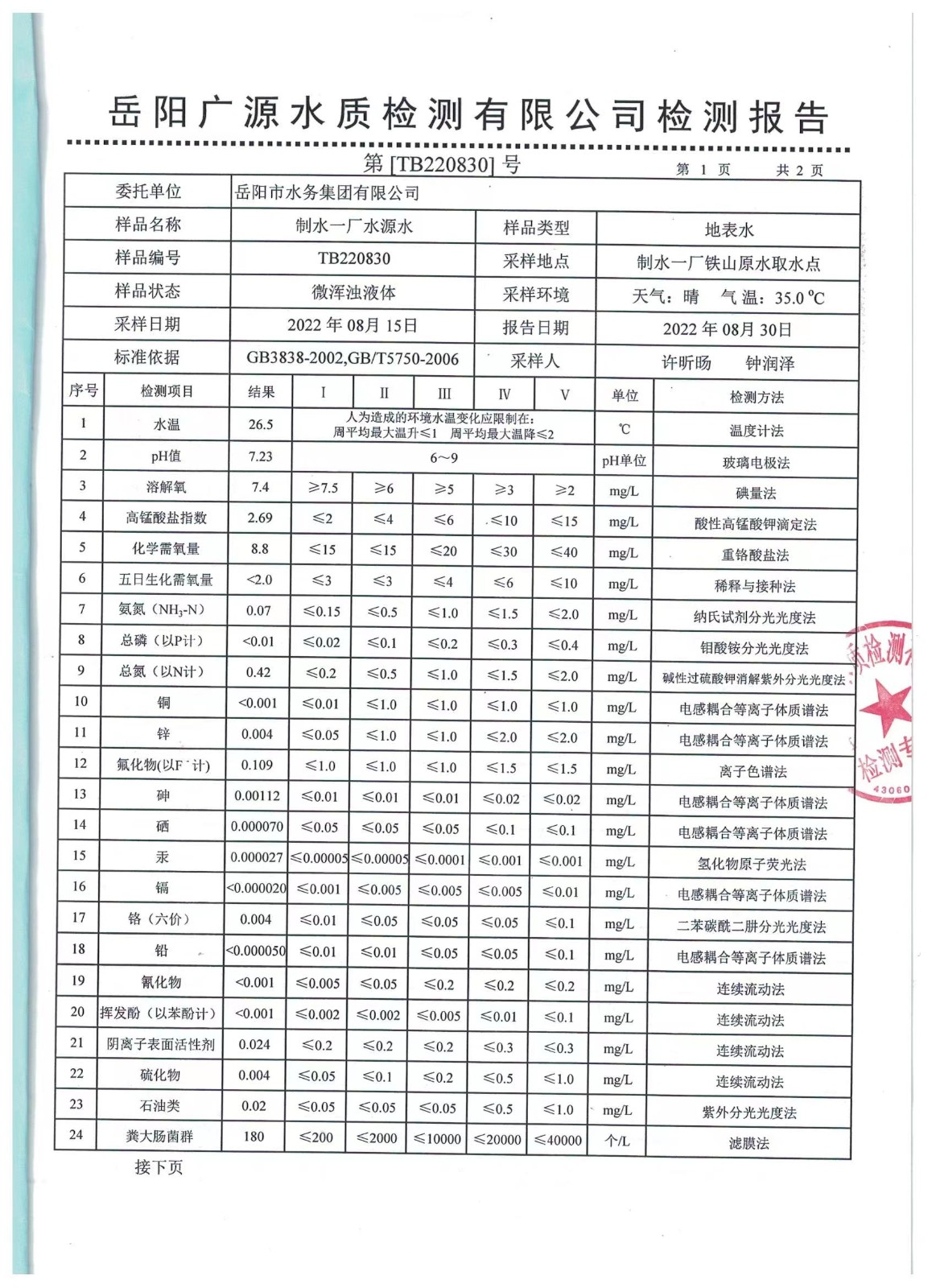 上一篇:2022年08月岳陽市水務(wù)集團出廠水水質(zhì)檢測月報表