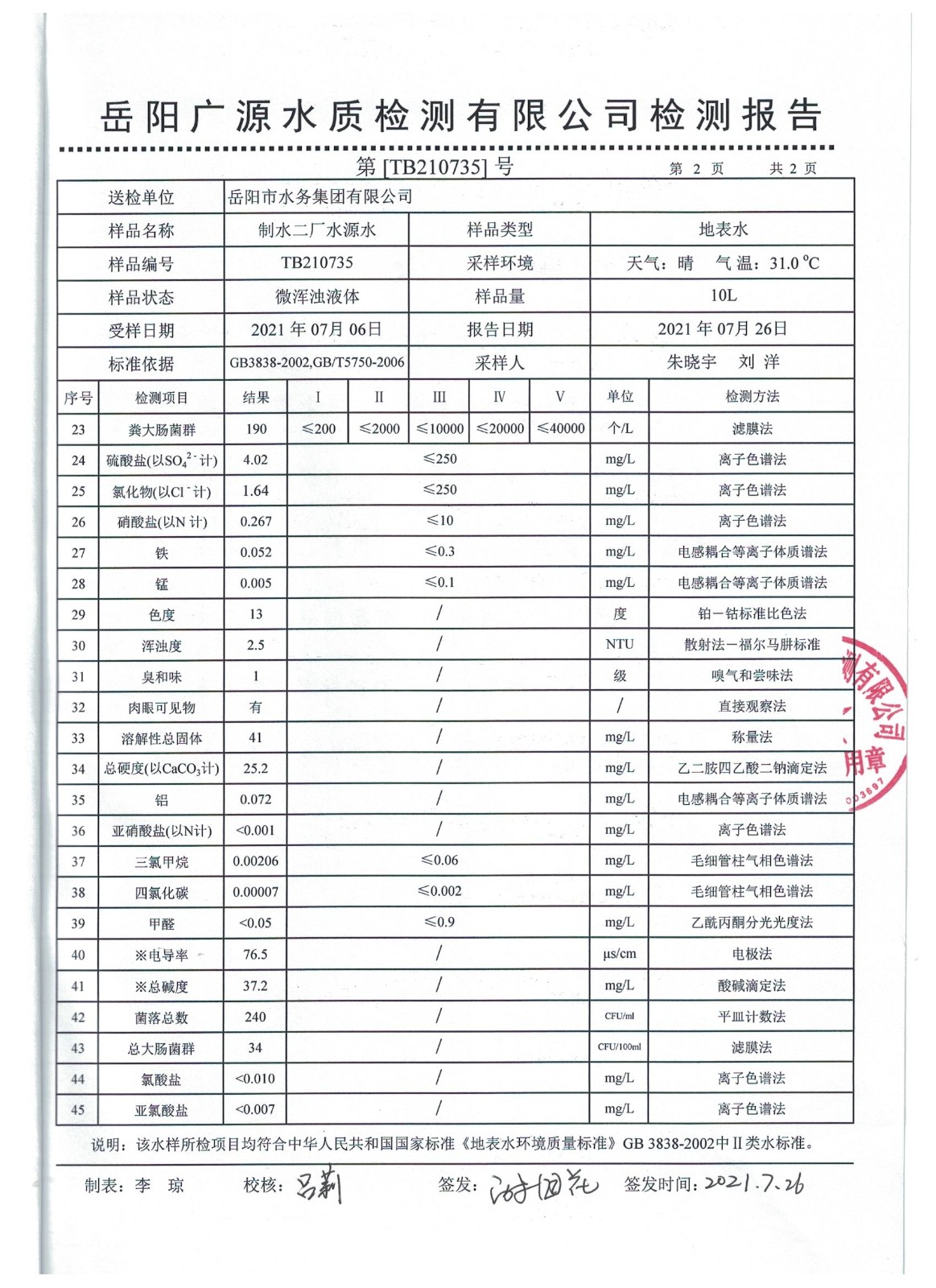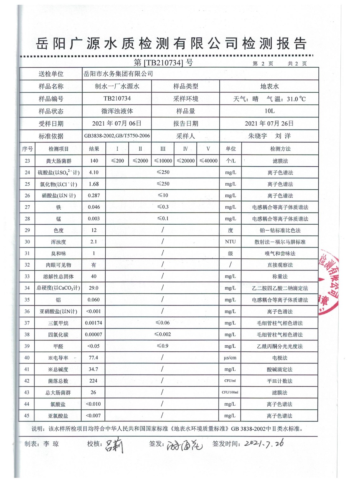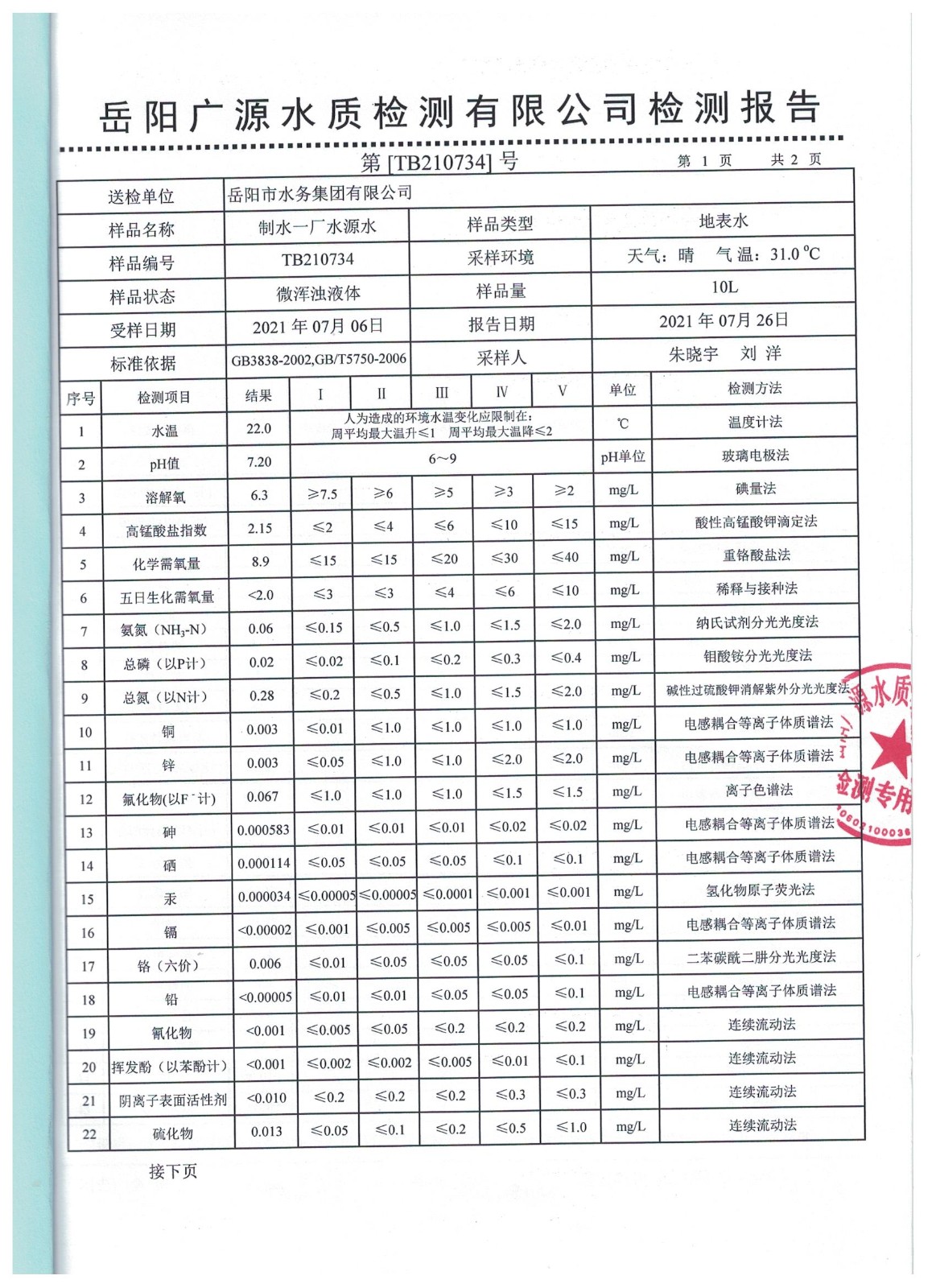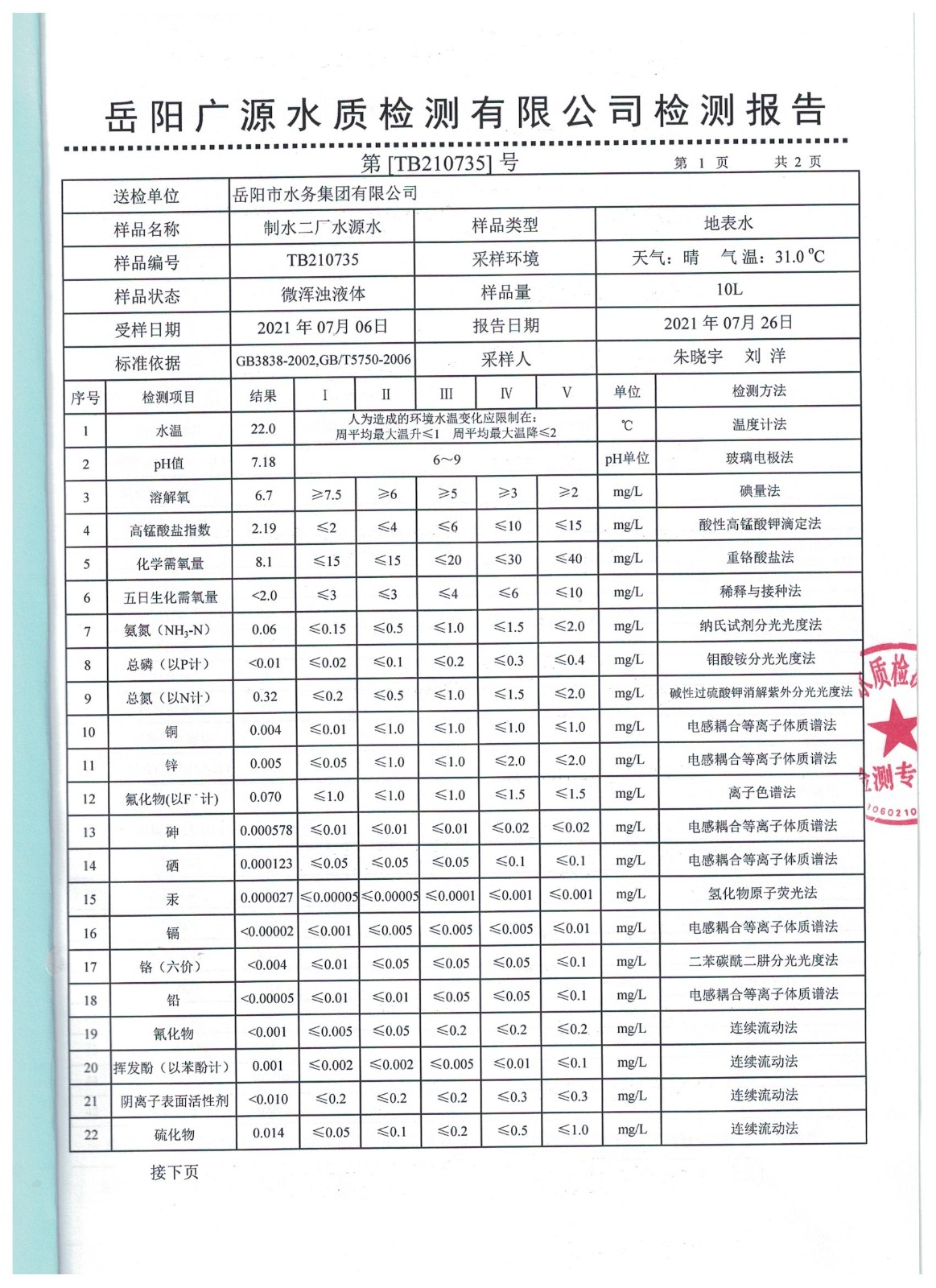 上一篇:2021年07月岳陽市水務(wù)集團出廠水水質(zhì)檢測月報表