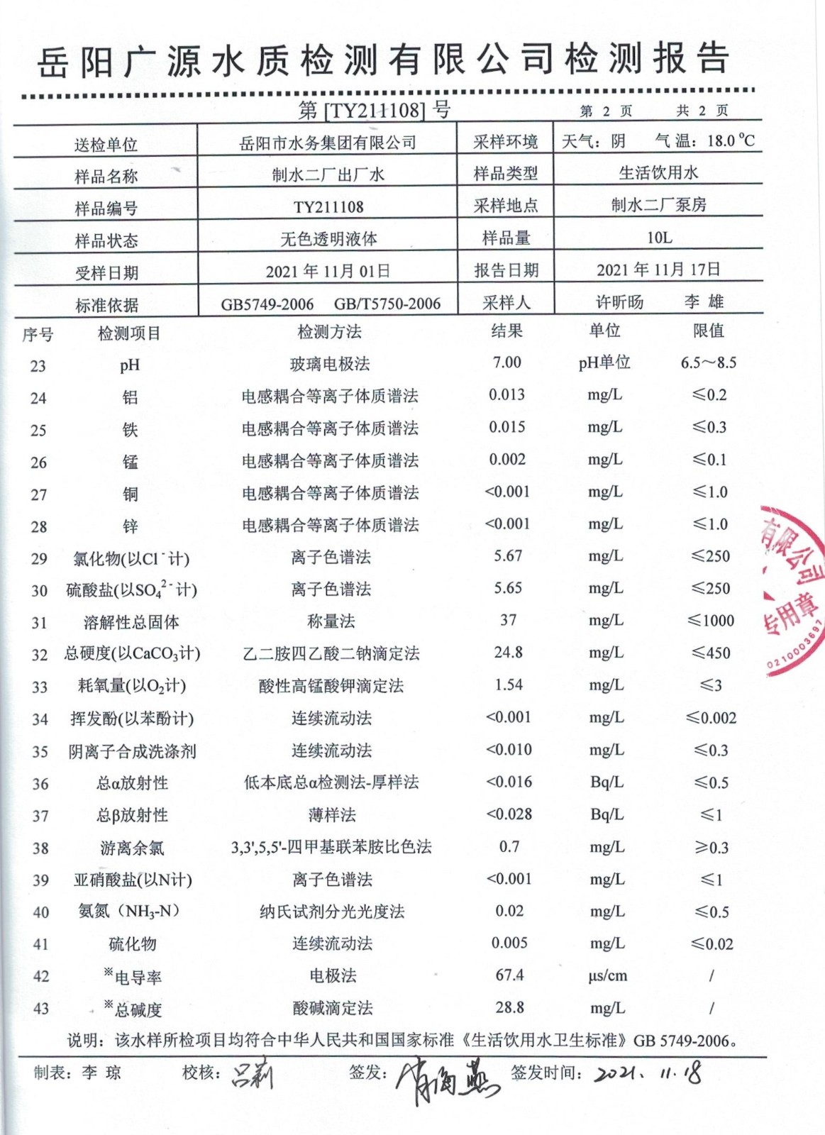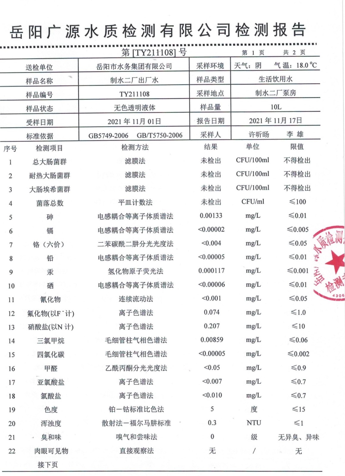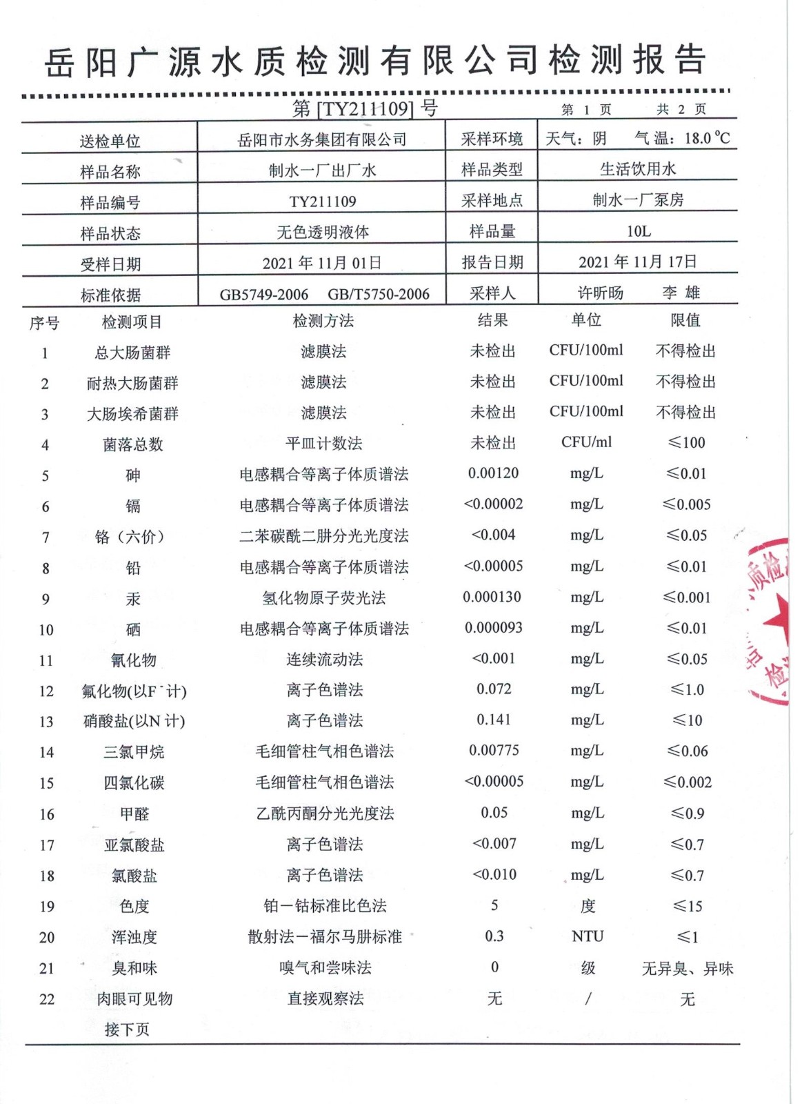 下一篇:2021年11月岳陽市水務集團水源水水質(zhì)檢測月報表
