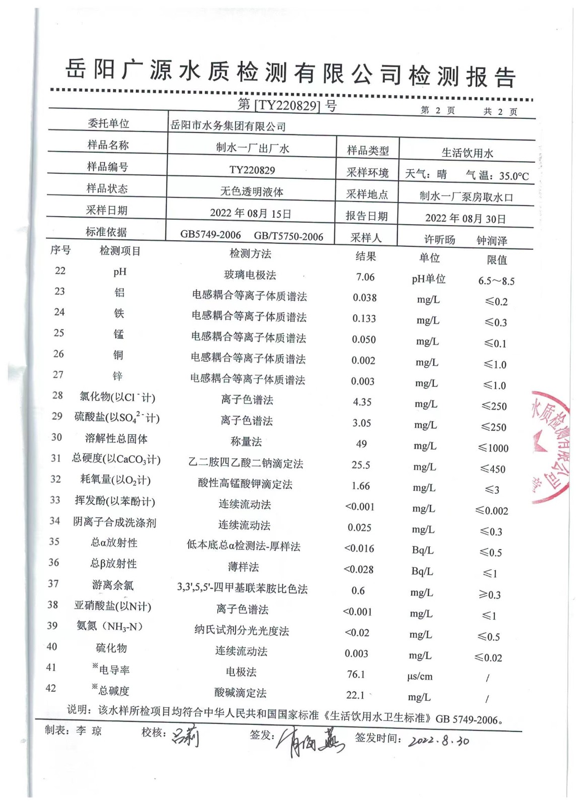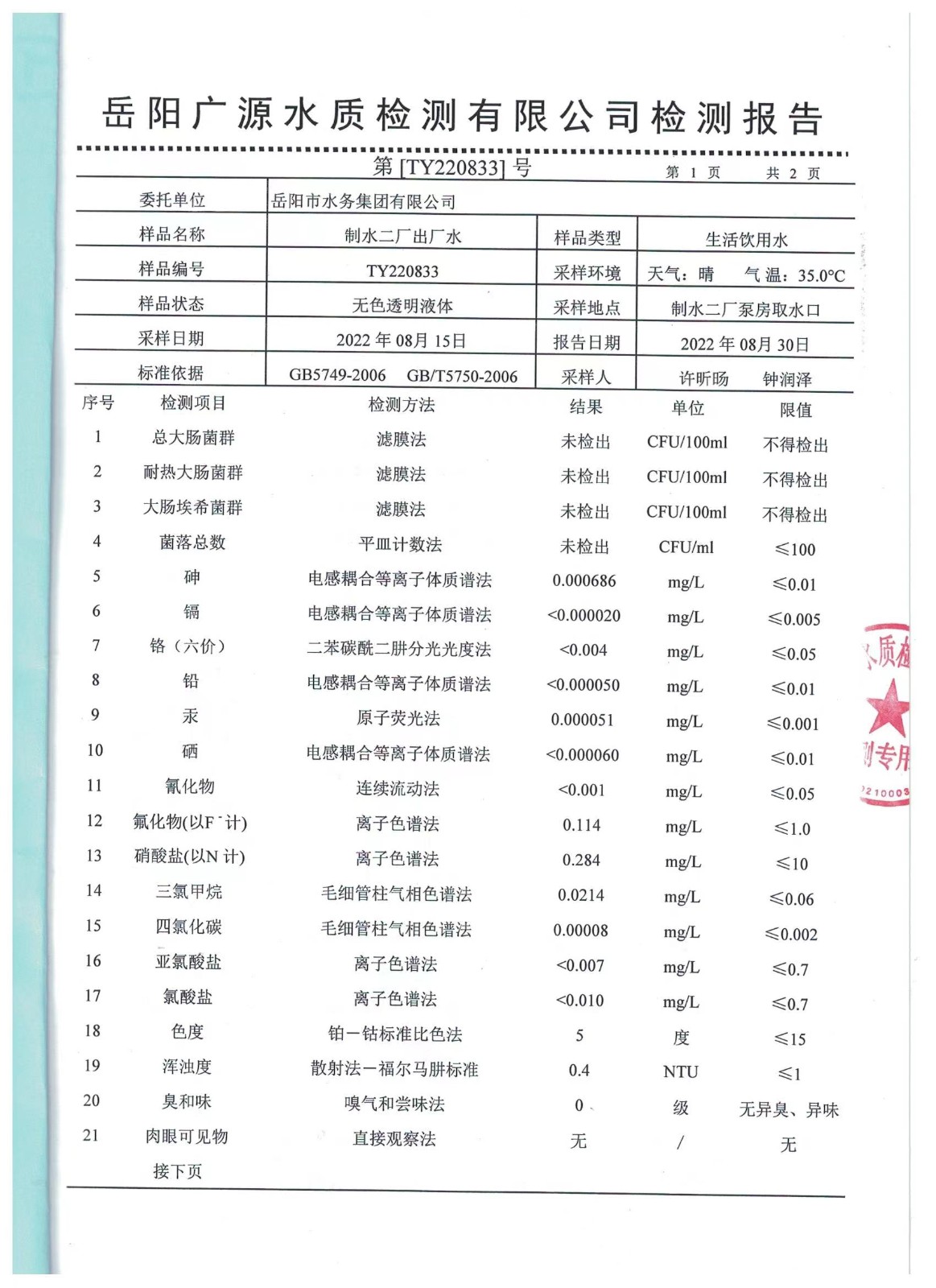 上一篇:2022年08月岳陽(yáng)市水務(wù)集團(tuán)管網(wǎng)水水質(zhì)檢測(cè)月報(bào)表