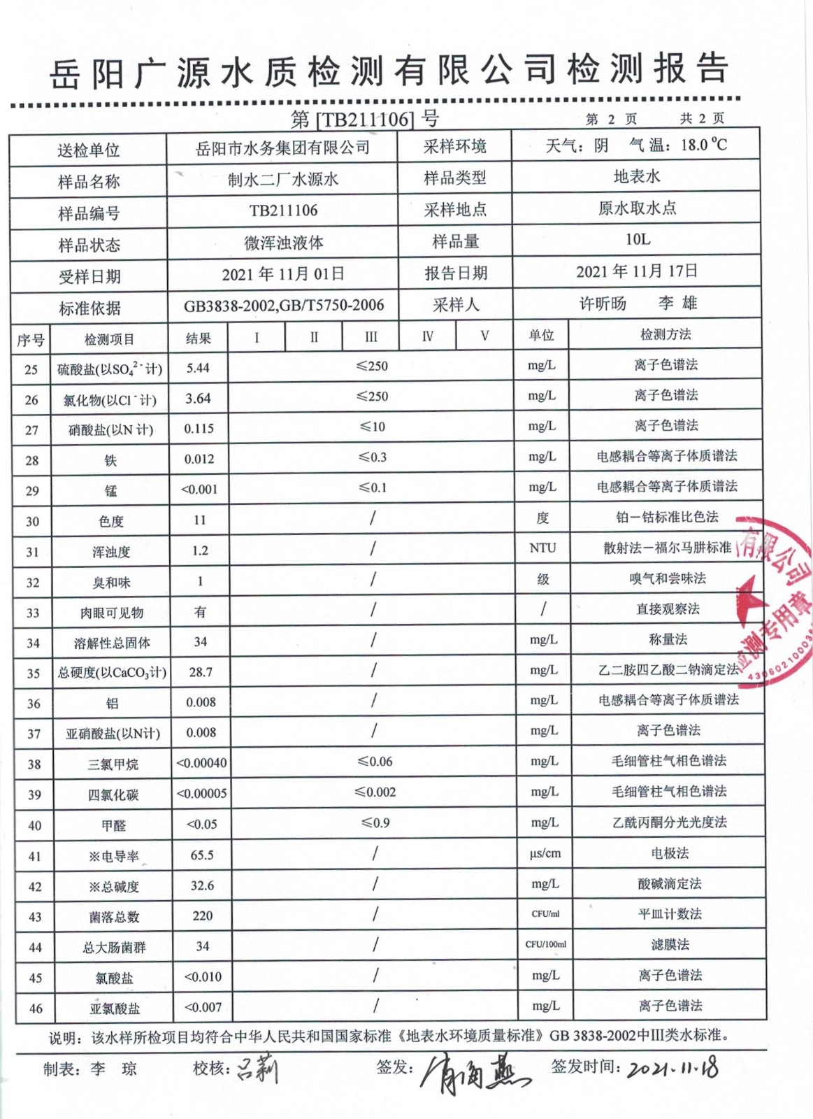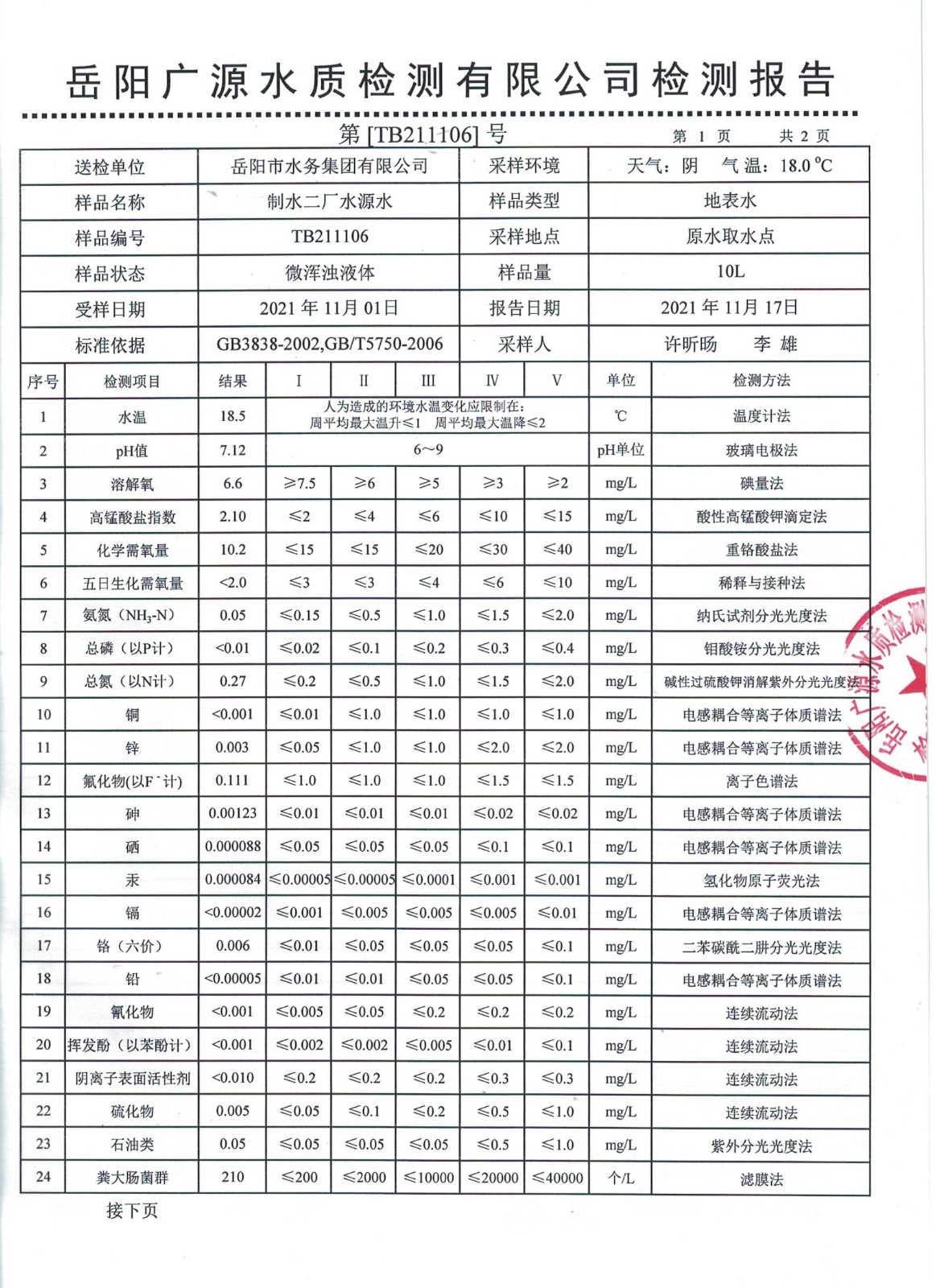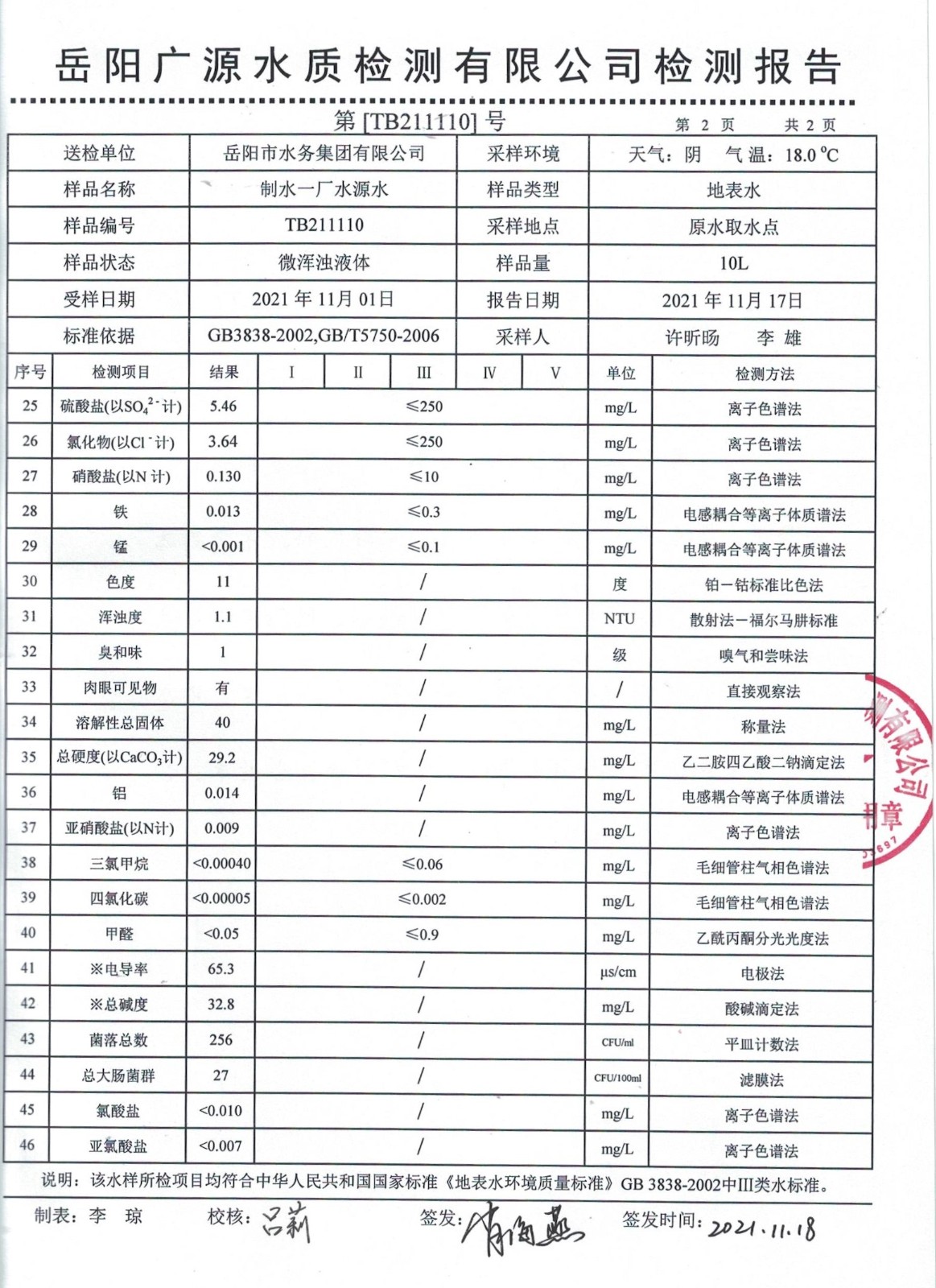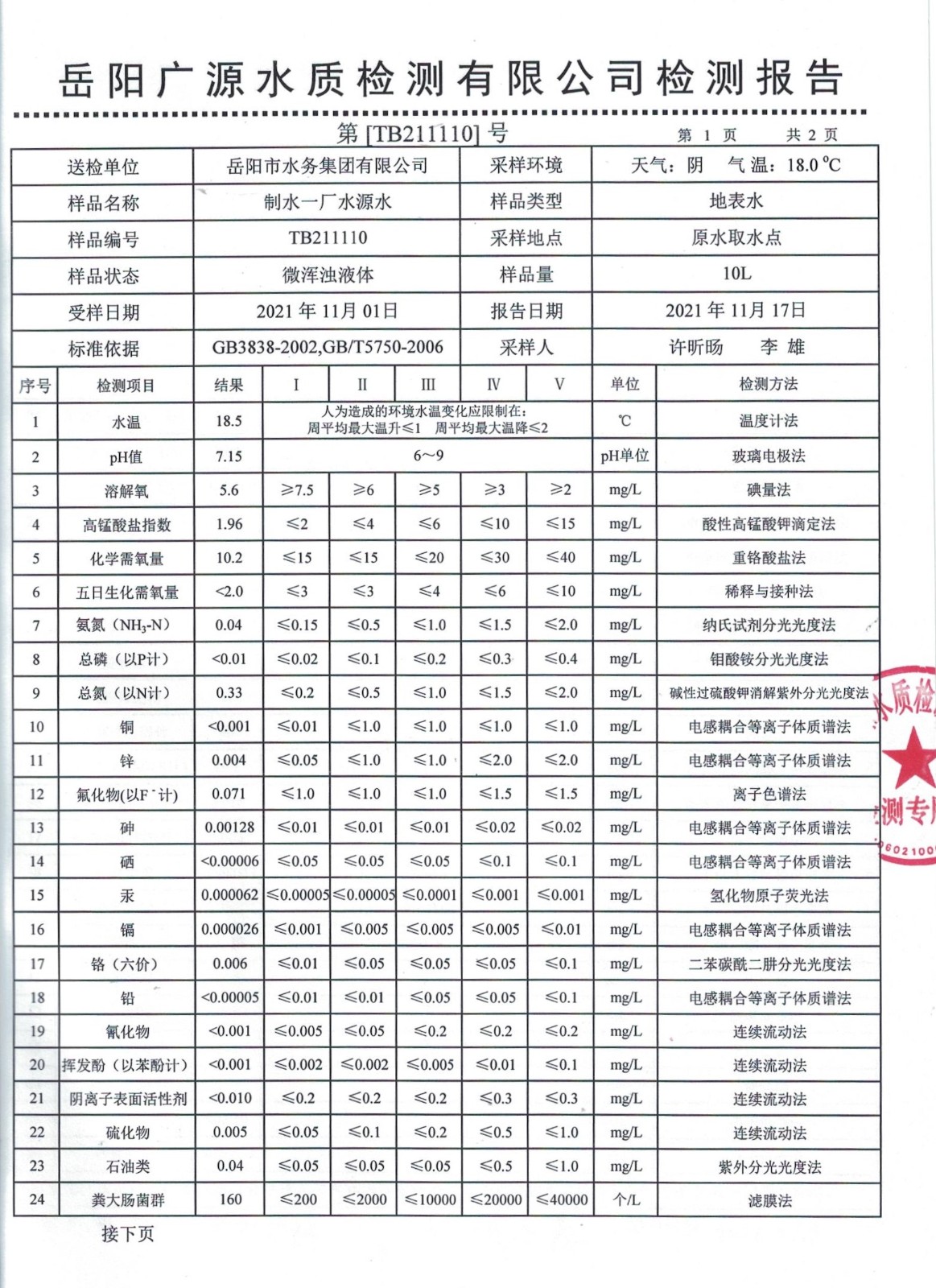 上一篇:2021年11月岳陽市水務(wù)集團出廠水水質(zhì)檢測月報表