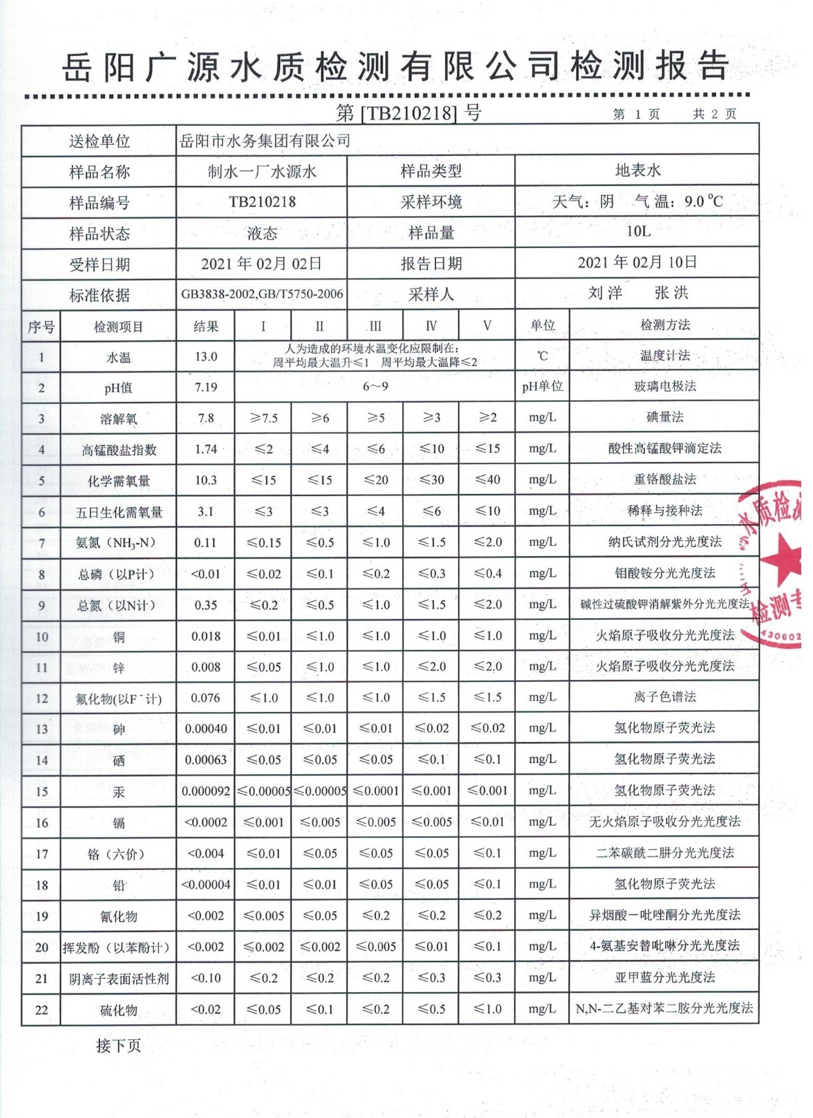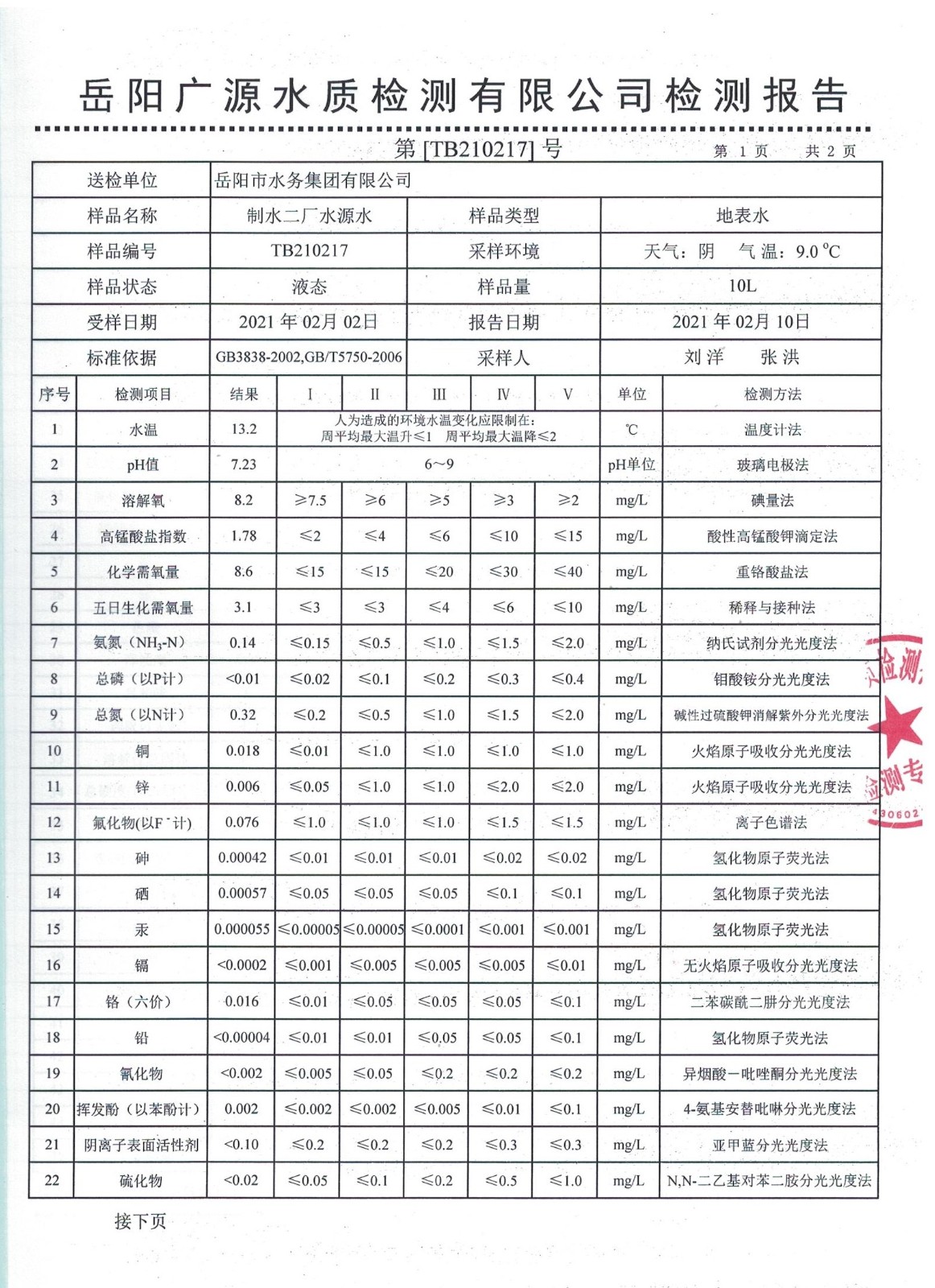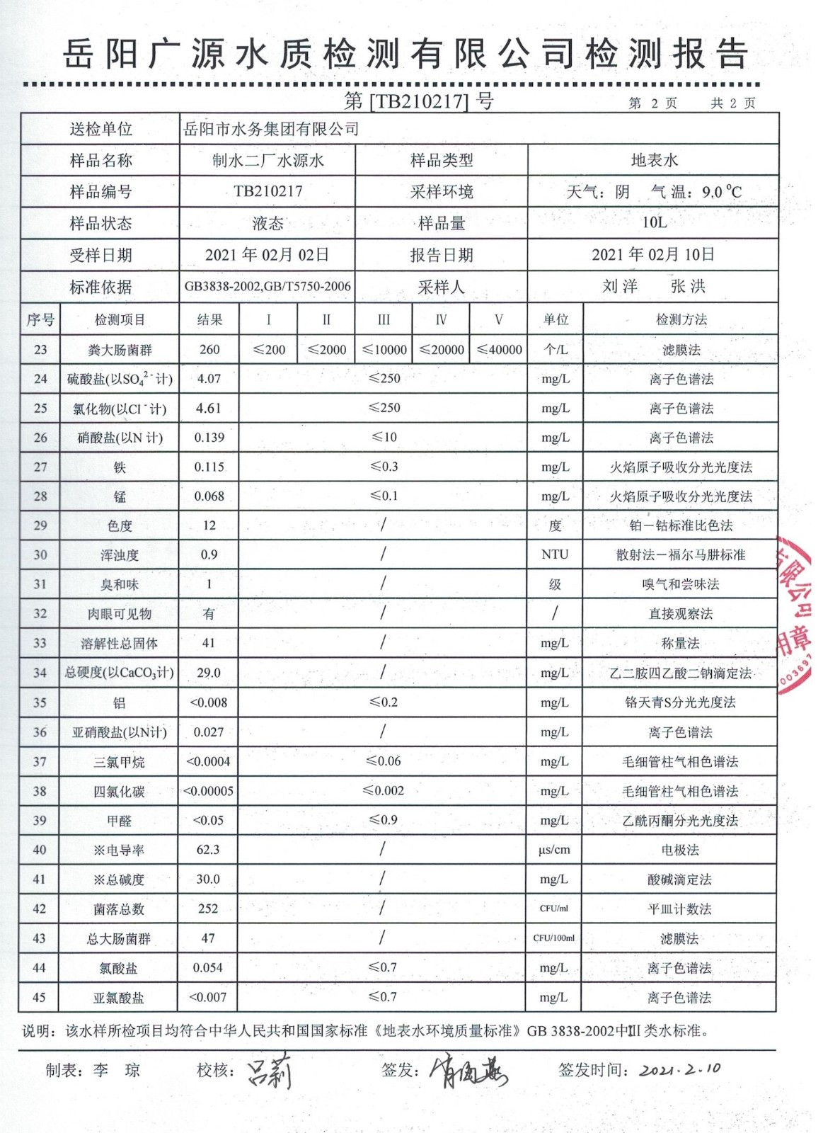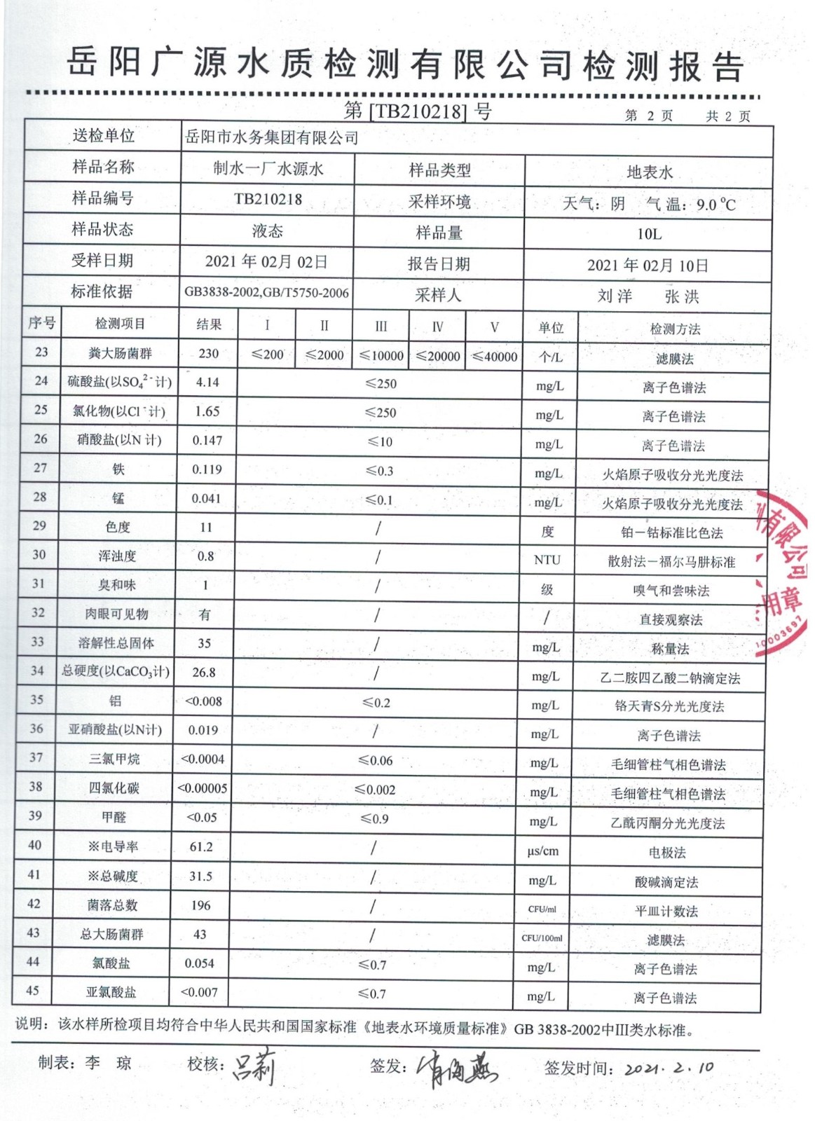 上一篇:2021年02月岳陽市水務(wù)集團出廠水水質(zhì)檢測月報表